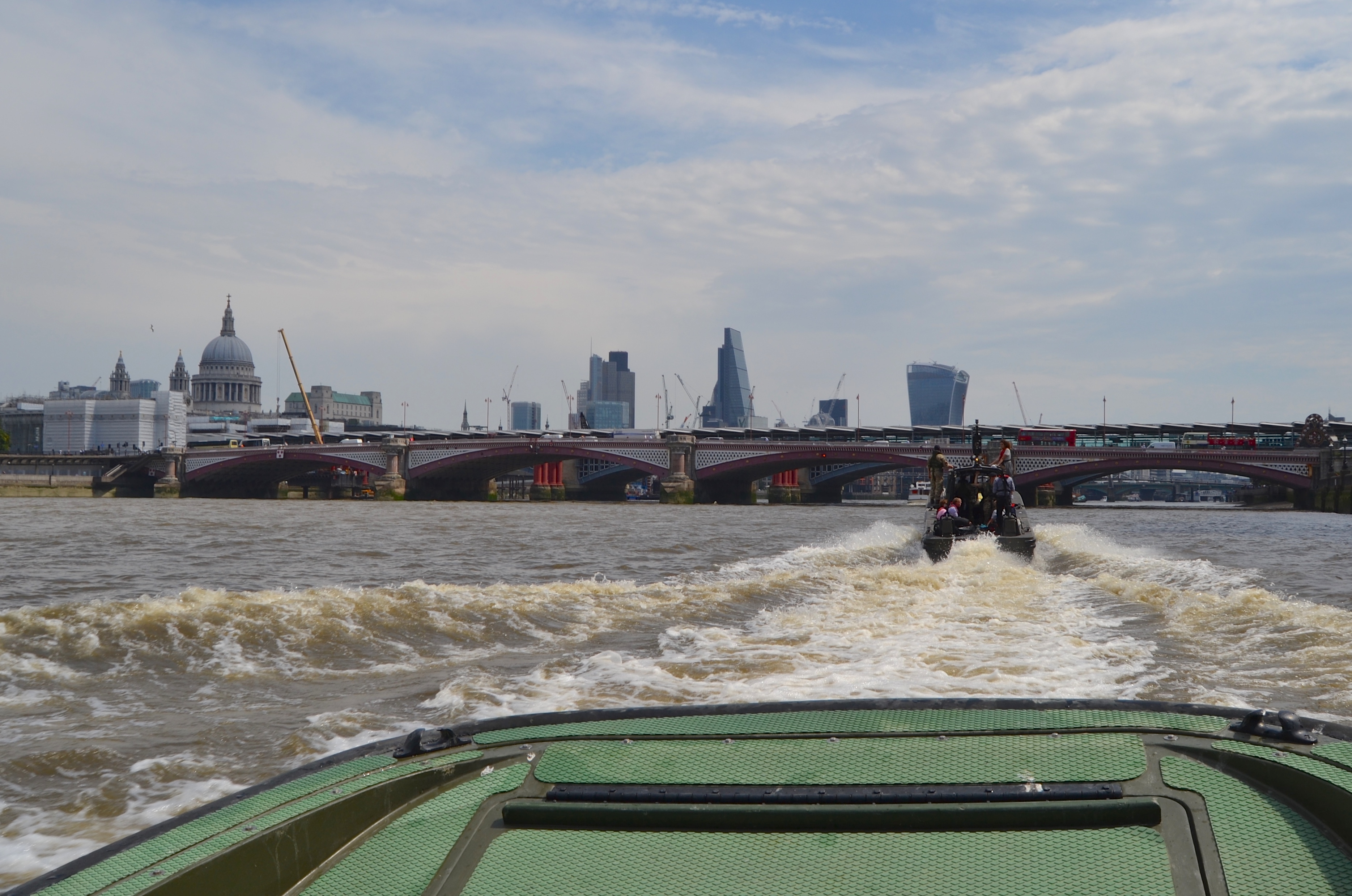 This year, the media covering the Doggett’s Wager were given a surprise at the end of the race at Cadogan Pier in Chelsea. Disembarking from the press launch, one of those wonderful craft that are most commonly seen carrying umpires up and down the Henley course, we expected to get the usual ride back to the little victory ceremony at Fishmongers’ Hall on one of the big Thames Passenger Boats that followed the race. However, this year, we were directed to a couple of small military boats manned by Commandos of the Royal Engineers. Some went on what is called a ‘Combat Support Boat’ and others, including myself, volunteered for the more adventurous ‘Rigid Raider’.
