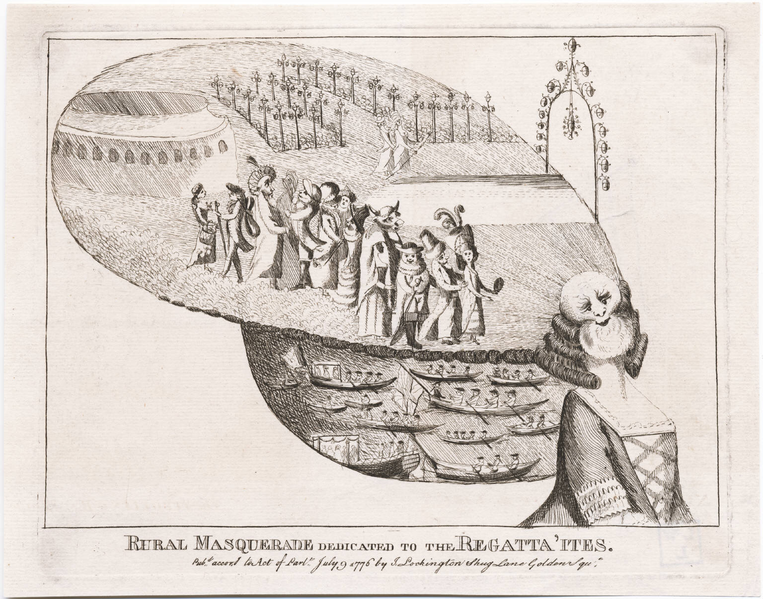 A peculiar and slightly disturbing cartoon of 1776 titled ‘Rural Masquerade Dedicated to the Regatta’ites’. The top part of the headdress shows figures in a garden dressed for a masquerade. Below is probably a scene from the Ranelagh Regatta. Despite the female body, the figure may be meant to be Neptune or Father Thames.