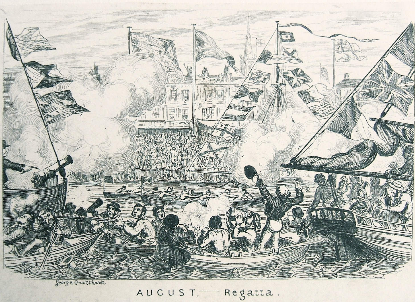 ….scaffold erections were to be seen on the banks….. Gambling tables lined the approaches to Westminster Bridge; men went about selling indifferent liquor, Regatta songs and Regatta cards. The river banks now resembled a great fair, and the Thames itself a floating town.