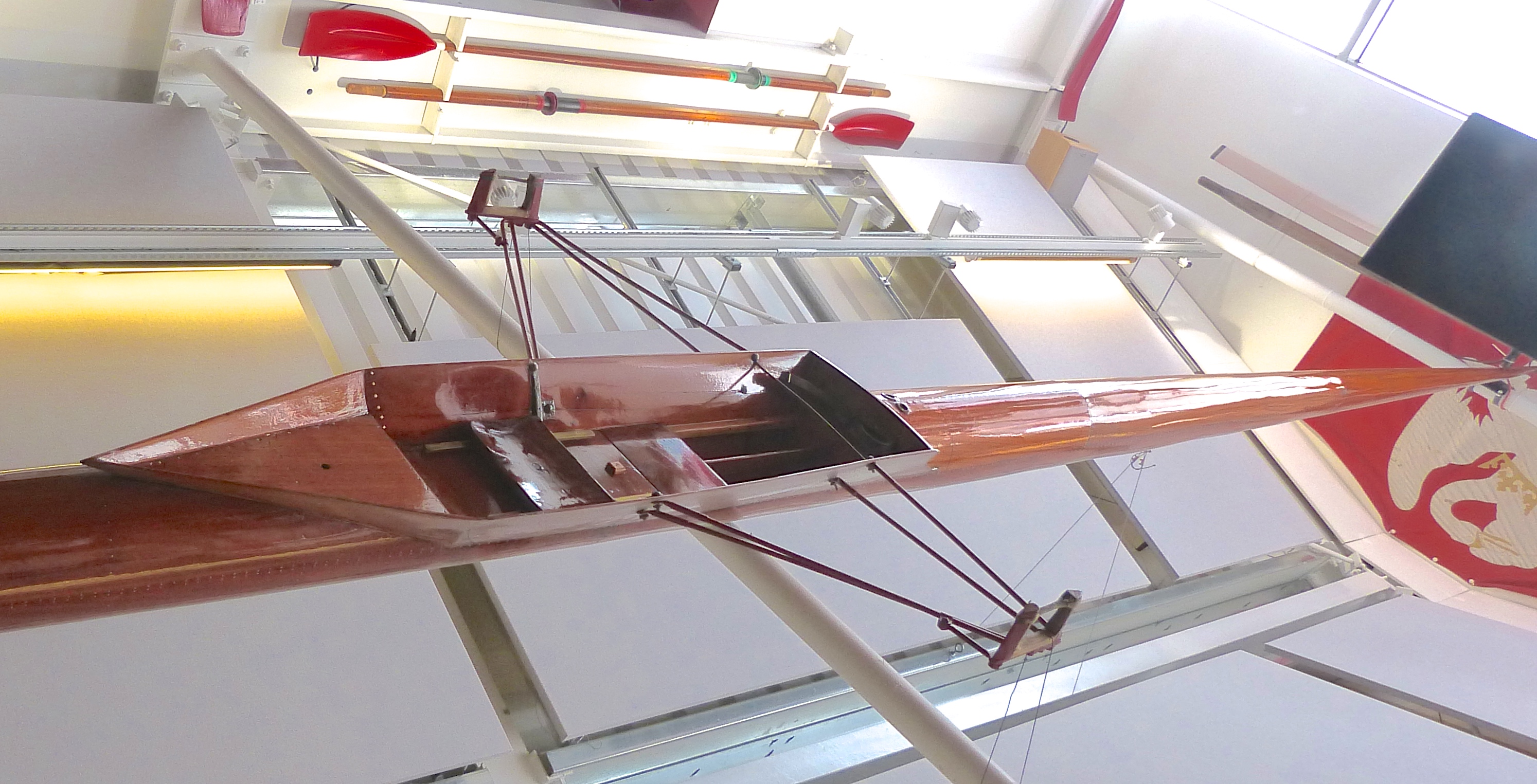 The most remarkable survivor of the fire was a unique, 150-year-old sculling boat that hung from the ceiling of the old bar and which now occupies the same position in the new building. It is perhaps best appreciated by first studying a print that is contemporary with the boat and which Marlow has recently acquired. Amazingly, the boat in the picture and the boat hanging above it are one of the same.