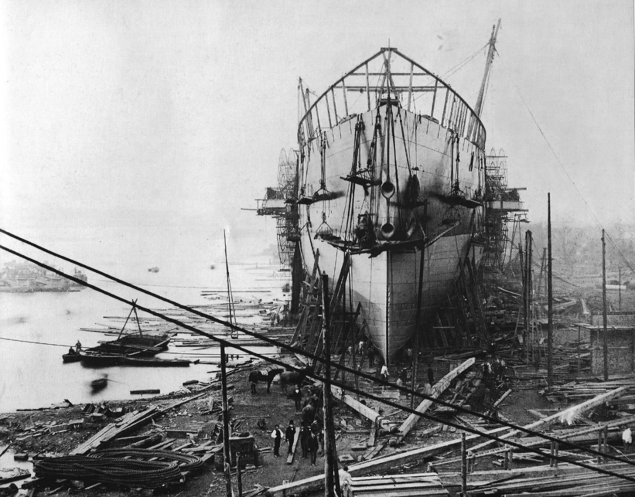 The Great Eastern was an iron sailing steam ship designed by Isambard Kingdom Brunel, and built by J. Scott Russell & Co. at Millwall on the River Thames, London. She was by far the largest ship ever built at the time of her 1858 launch, and had the capacity to carry 4,000 passengers from England to Australia without refuelling. Her length of 692 feet (211 m) was only surpassed in 1899 by the 705-foot (215 m) 17,274-gross-ton RMS Oceanic, and her gross tonnage of 18,915 was only surpassed in 1901 by the 701-foot (214 m) 21,035-gross-ton RMS Celtic. With five funnels (later reduced to four), she was one of a very few vessels to ever sport that number, sharing her number of five with the Russian cruiser Askold – though several warships, including HMS Viking, and several French cruisers of the pre-dreadnought era had six.
