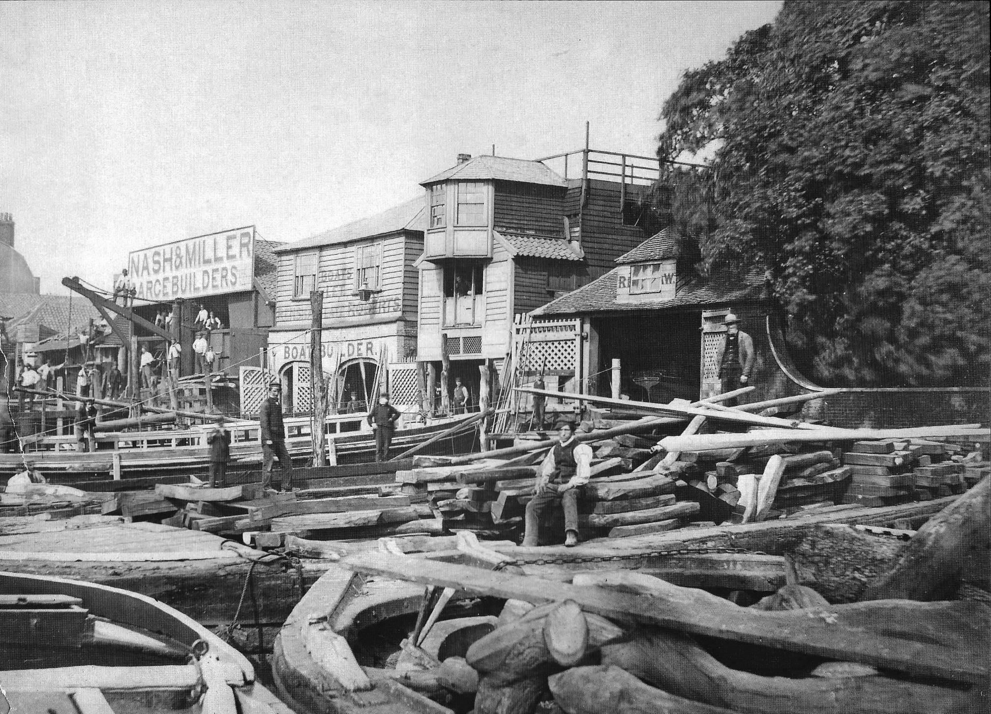 The photograph is from the Charles Woolley collection. From this and a contemporary photo it is possible to surmise that N&M specialised in the building of Thames Lighters, the trade in livery company barges having, by then, died out.