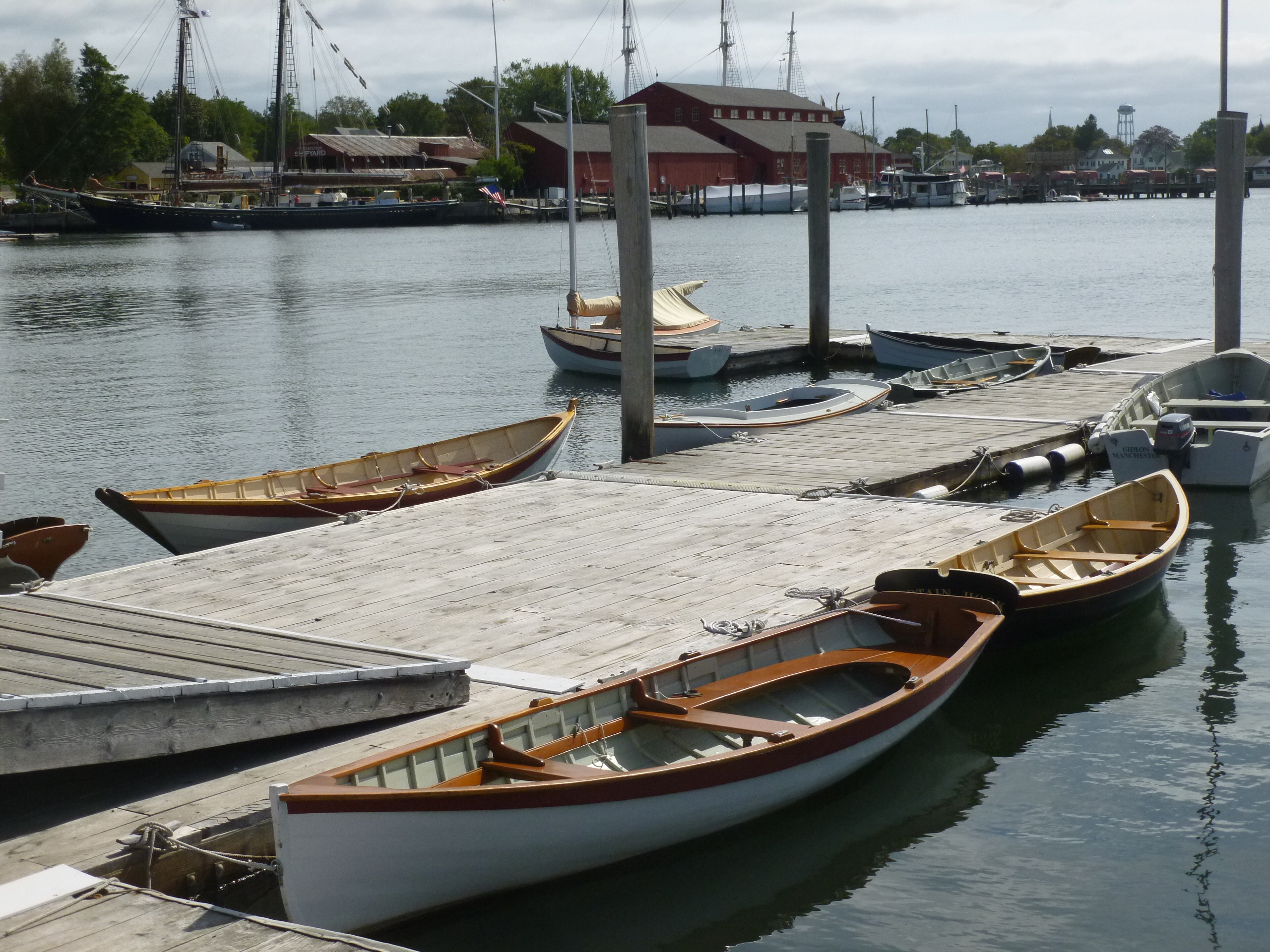 It took a little while for me to get used to the fixed seat in the peapod, but I guess I managed. Out of the three boats I rowed, Captain Hook, a 12-foot Whitehall ‘pulling boat’, is probably the one that I enjoyed most. This boat type was built in Maine, where they were called ‘round-bottom rowboats’, but they were built exactly like the Whitehalls of Boston and New York. Though, I agree with Bolster about what he writes, I am a little more of a snob than he is, I like the boats to be built out of wood. And I find them at the Boathouse at Mystic Seaport, but please note, it is a seasonal business at the museum.