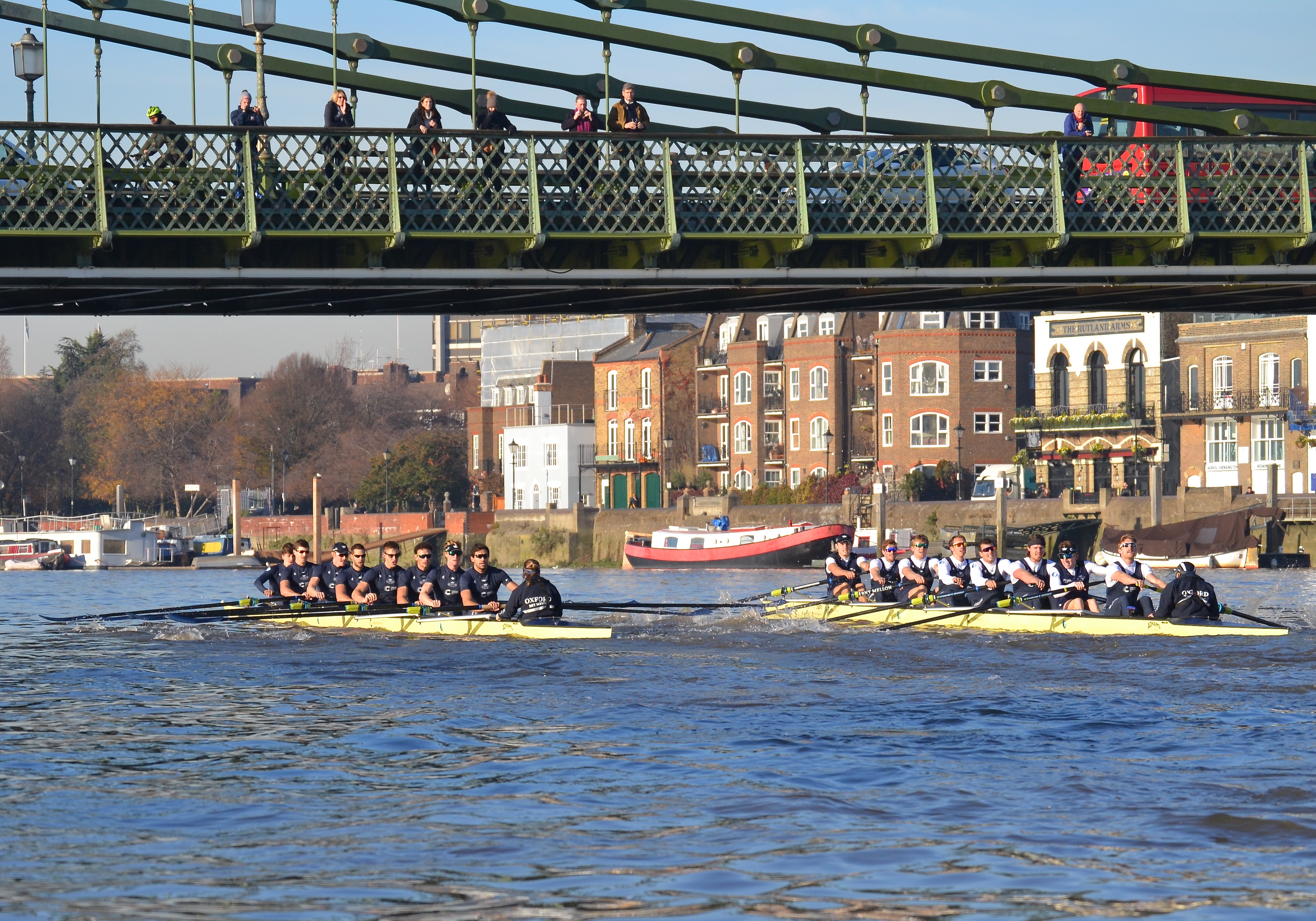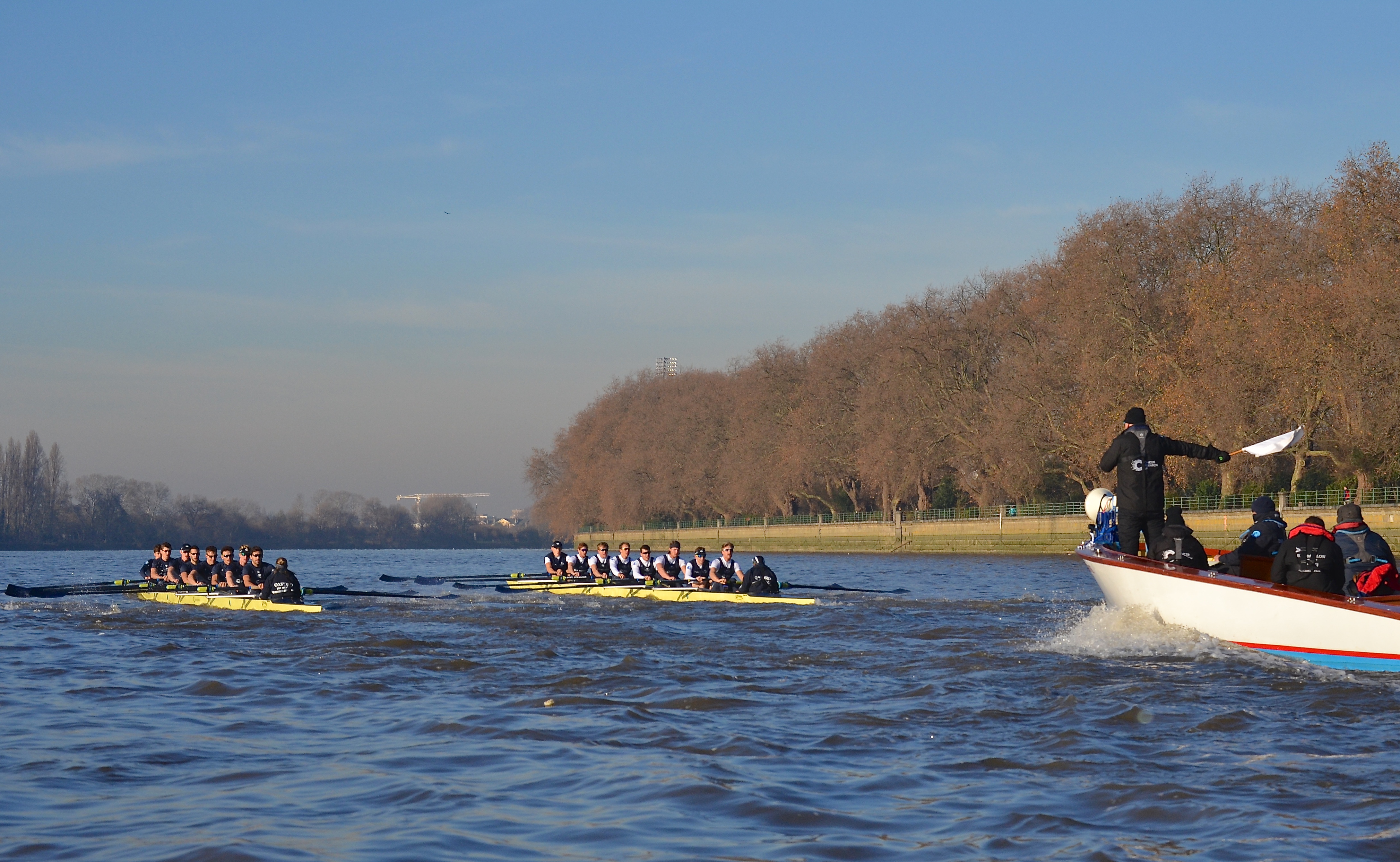 Side-by-side, one-on-one racing for 4 1/4 miles on the Thames Tideway in December can be a very testing experience – and it is exactly for this reason that the ‘Trial Eights’ are usually held at this time…. While the contenders for the Blue Boats are thoroughly tested in the gym, on the ergo, and on the water at Ely for Cambridge and at Wallingford for Oxford, it is only on the Thames Tideway itself that the coaches can see what their rowers and coxswains are really made of, how they cope with nerves and mistakes and also how they react to whatever the most famous and possibly the most unpredictable rowing course in the world throws at them. Old Father Thames may have been playing host to rowing crews for hundreds of years – but he can still take them by surprise.