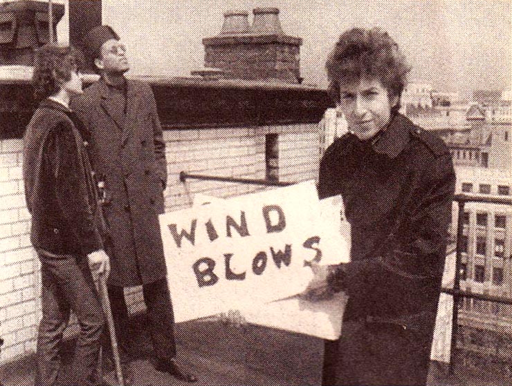 ‘You don't need a weather man to know which way the wind blows.’ Dylan (on the roof of the Savoy with Bob Neuwirth and his record producer Tom Wilson) relays the weather conditions on the Thames to his fans around the world. Photo: Pennebaker Films.