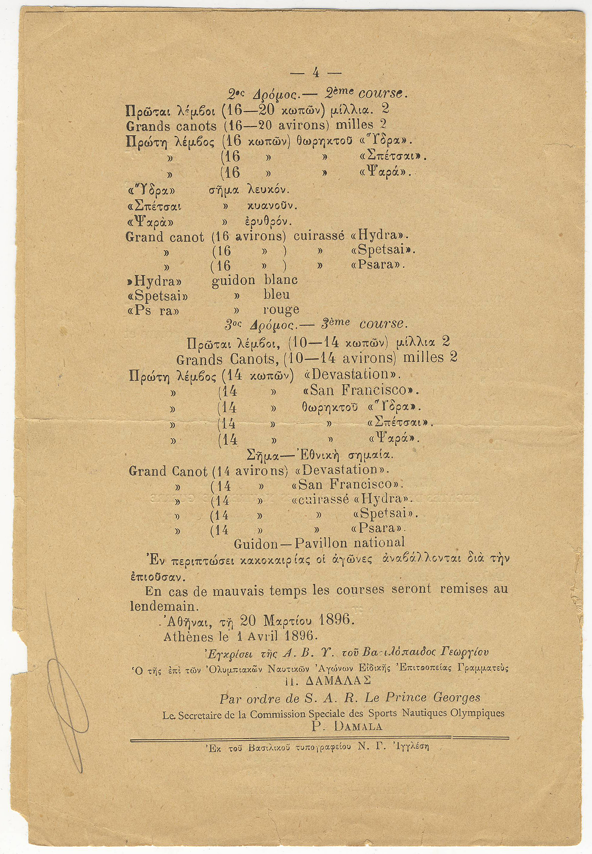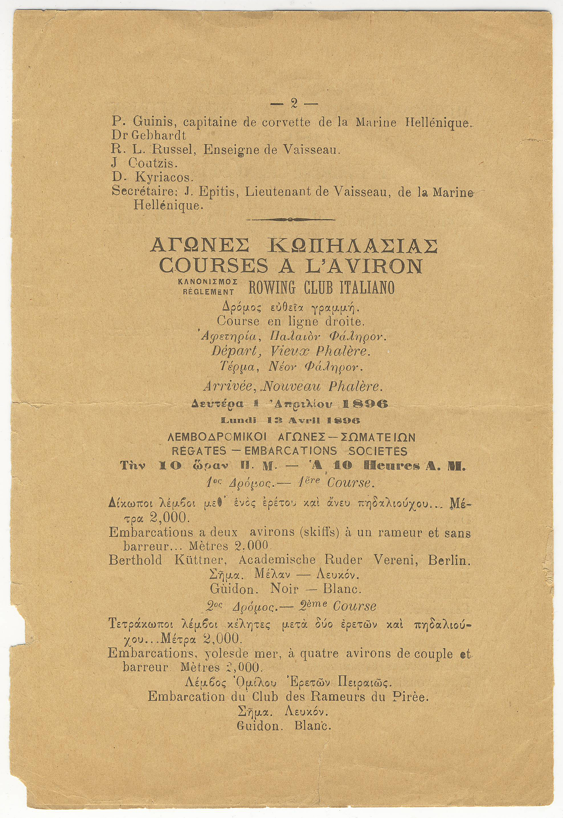 On the second page we learn that the regatta was to be conducted under the regulations of the ‘ROWING CLUB ITALIANO’, over a straight course from Old Phalere to New Phalere on the 1 April 1896 (Julian/Greek calendar) or 13 April 1896 (Gregorian calendar used by most of the rest of the world).