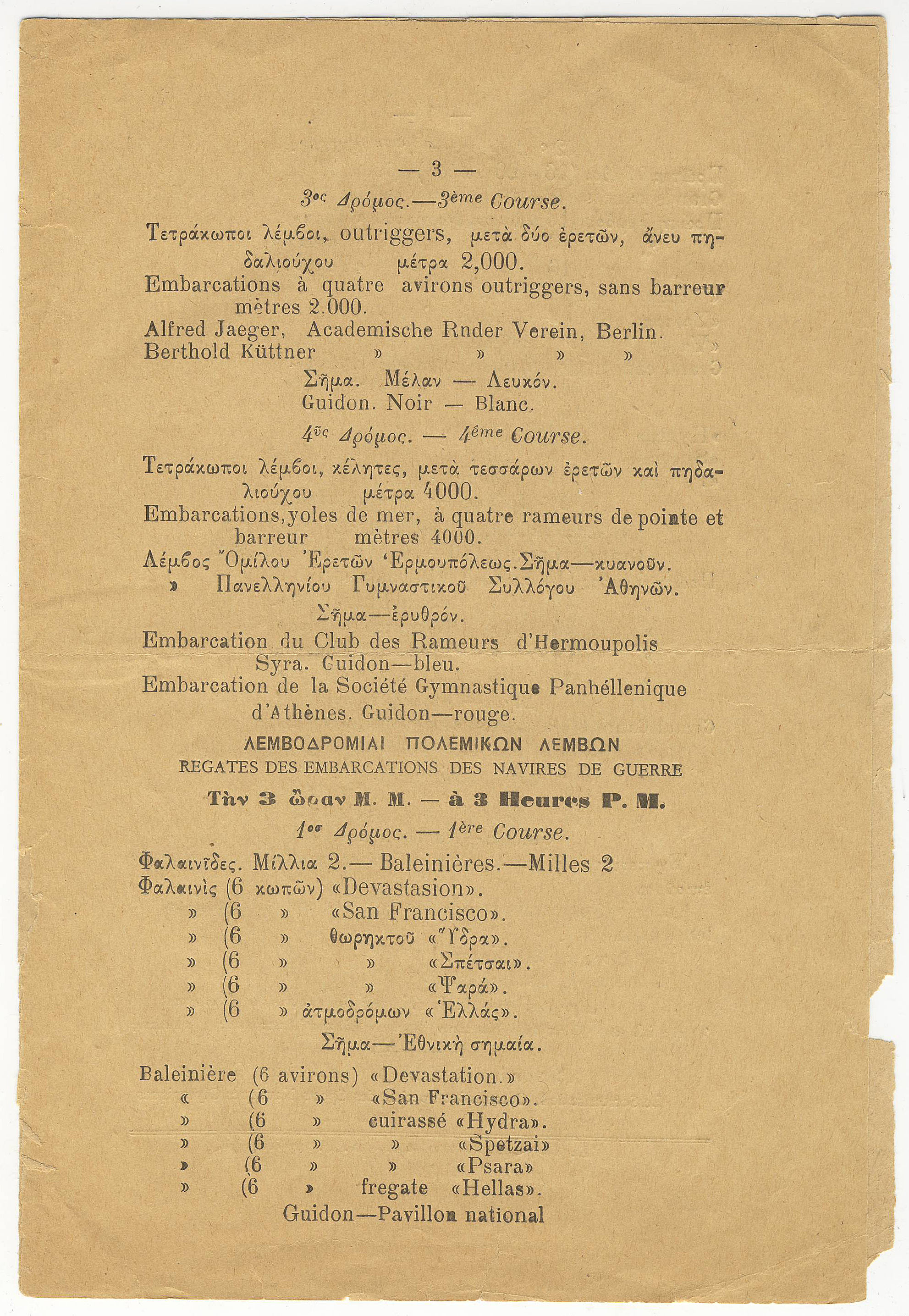 The programme confirms that the Hermopolis Rowing Club was from Syra (French spelling). Now known (in English) as Syros Nautical Club (1893), they also mention the 1896 Olympic regatta on their website (my rough translation):