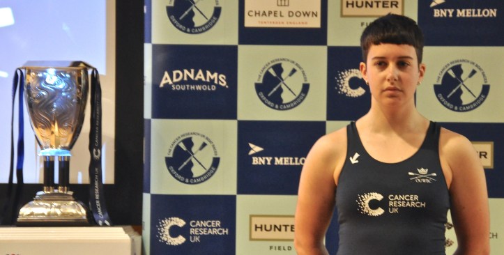 Alice Roberts, ‘2’ for Oxford, next to the trophy that she hopes to lift on 2 April. Her opposite number in the Cambridge boat is Imogen Grant.