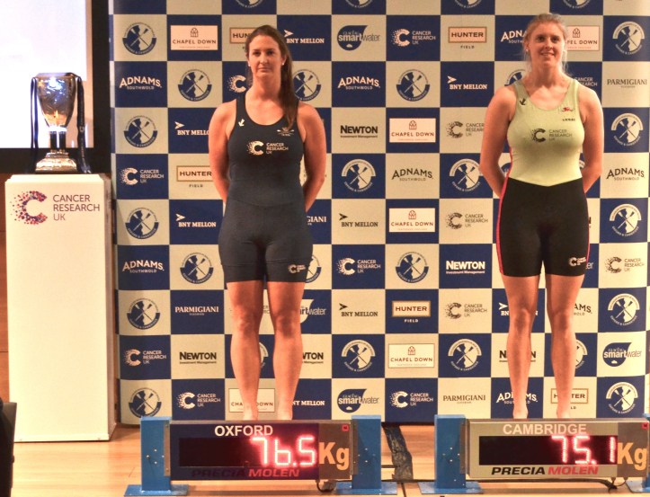 Oxford cox, Eleanor Shearer, and Cambridge cox, Matthew Holland, stand at the head of their respective crews. There seems to be a weigh in photograph custom that Oxford scowls and Cambridge smiles. Oxford Stroke, Jenna Herbert (on the right, 2nd step up), may be fighting the urge break this tradition.