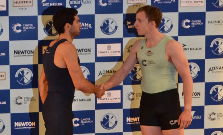 A firm handshake between the men at ‘7’, James Cook (Blue) and Lance Tredell (Blue and CUBC President).