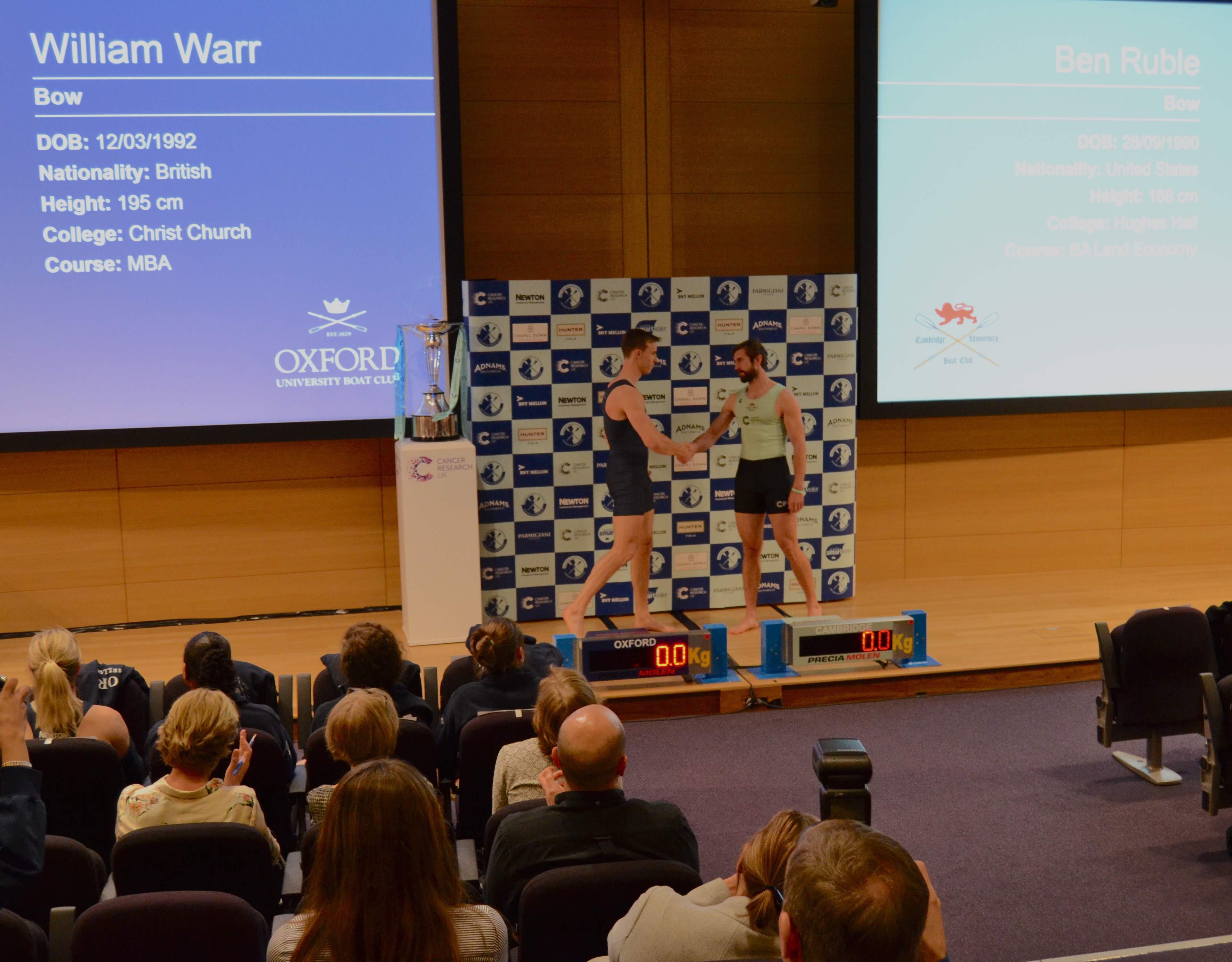 A firm handshake between the men at ‘7’, James Cook (Blue) and Lance Tredell (Blue and CUBC President).
