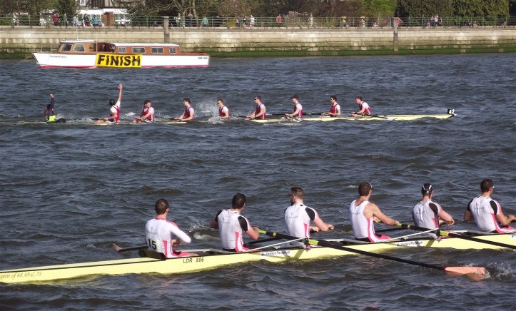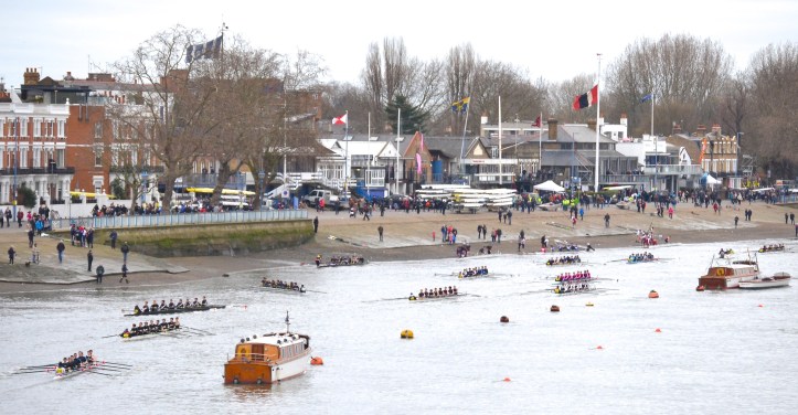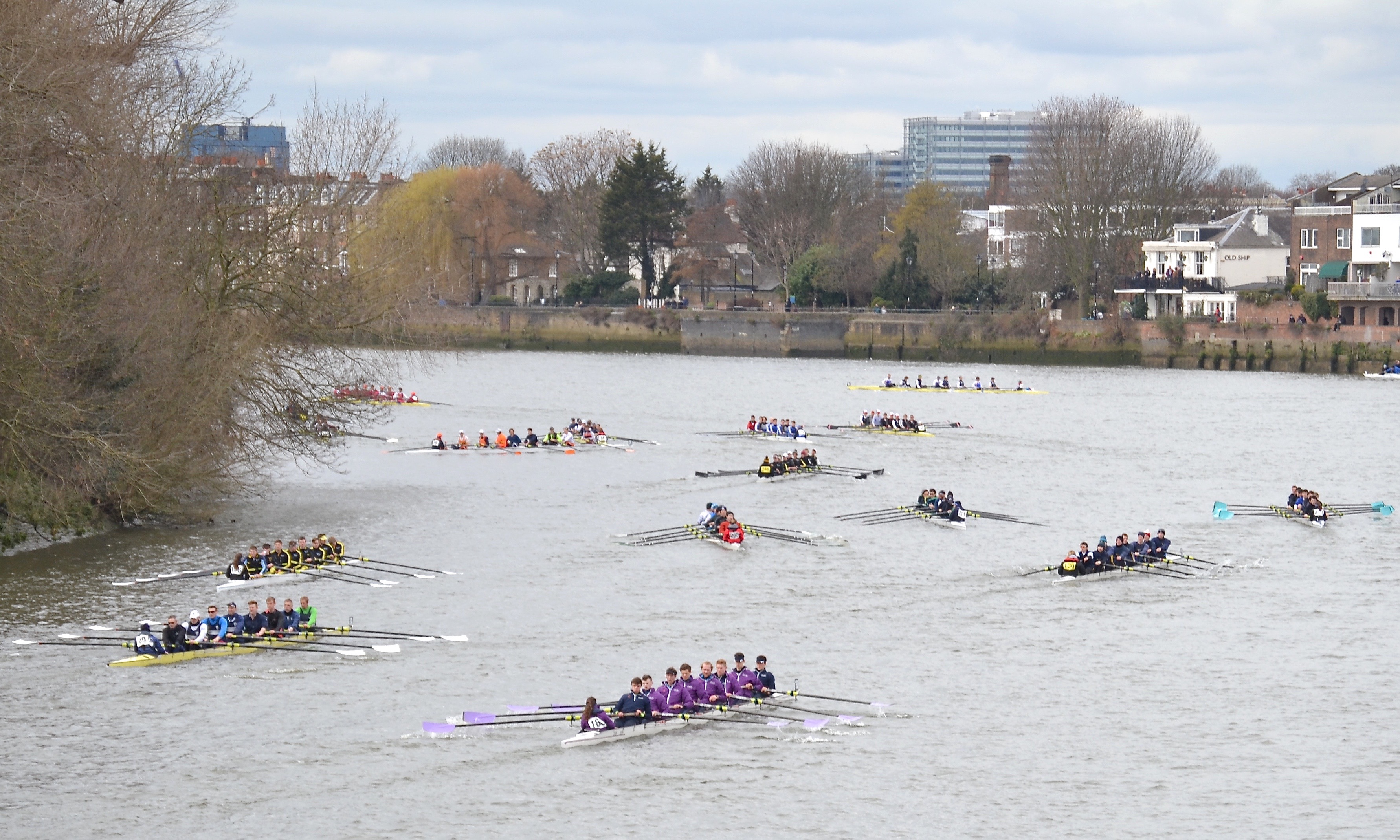 Conditions at the Women’s Head of the River in 2016 were especially difficult with a strong stream and a brisk north-easterly wind. Crews marshalling on Surrey were being pushed onto the shore, and the tide could turn an eight in a few moments. Several crews were caught out by the fast running tide, including one which was completely turned around twice. The chaos caused by an eight facing the wrong way in the middle of a marshalling division has to be seen to be believed. More than one crew lost their fin as they were pushed onto the uneven shore, ending their race before they had a chance to even start.