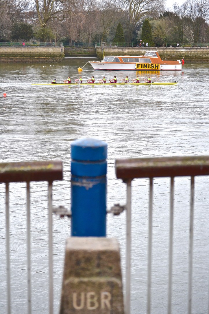 Most, though not all, head races are rowed in winter on the ebb tide, when the natural downstream flow of the river is added to the astronomic tide pulling water out of the Thames. The upriver limit of the tidal Thames (the Tideway) is at Teddington lock, here the flow of water into the Tideway is constantly monitored – on average the Thames is running over the weir at around 65 cubic metres per second and in winter it may (albeit rarely) exceed 500 cubic metres per second. In other words there may be 500 tonnes of water pouring downstream towards the North Sea every second. In addition to the potentially very fast flowing water the weather in winter is often far from pleasant.