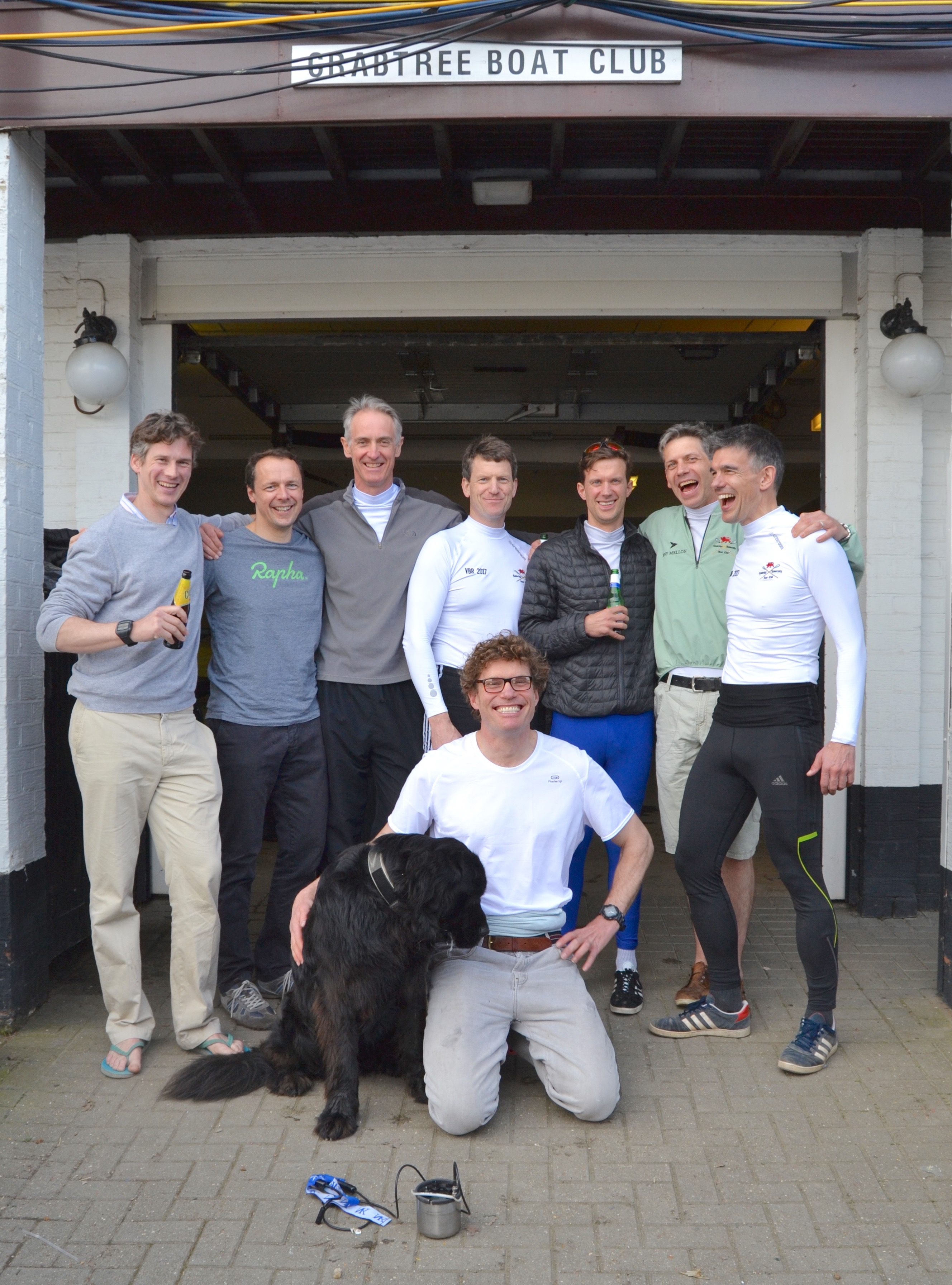 We were dropped at the start, they were fabulous, I thought that I was in the wrong race, and that we were racing some youngsters….. By the Mile Post we were in their water, bobbling around, wondering what’s happened…..? Most of us in the Cambridge Crew have done a fair amount of training… separately but also maybe five outings here on the Tideway. So, we had some self-confidence and had agreed that, were we to be behind, we would just stick with it. I have rowed so little in my life that I have never come through from behind, I was just hoping that the others would keep it together but (it turned out that) there were some wise old heads in the boat. It was extraordinary, coming back from behind…… We were a length and a quarter, length and a third down between the Mile Post and Harrods (but) by the time we got to (Hammersmith Bridge) we were less than half a length down….. Then we get under the bridge and there was this almighty war zone…… from rowing in their puddles, we were rowing side by side and we felt we were going through…. I starting hearing whoops from bow pair behind me, that was transmitted down the boat and we came together as a crew and started to pull through.…. we knew that we had eighteen strokes to the finish after the bridge and we knew that we could go through…. but unfortunately we were not able to row it because we clashed……. (The Veterans’ Race) is so nice to do, it’s the most hilarious thing…… everybody in the boat is in so much pain, thinking, ‘why do I do it, why do I do it?’, but thank God we do.