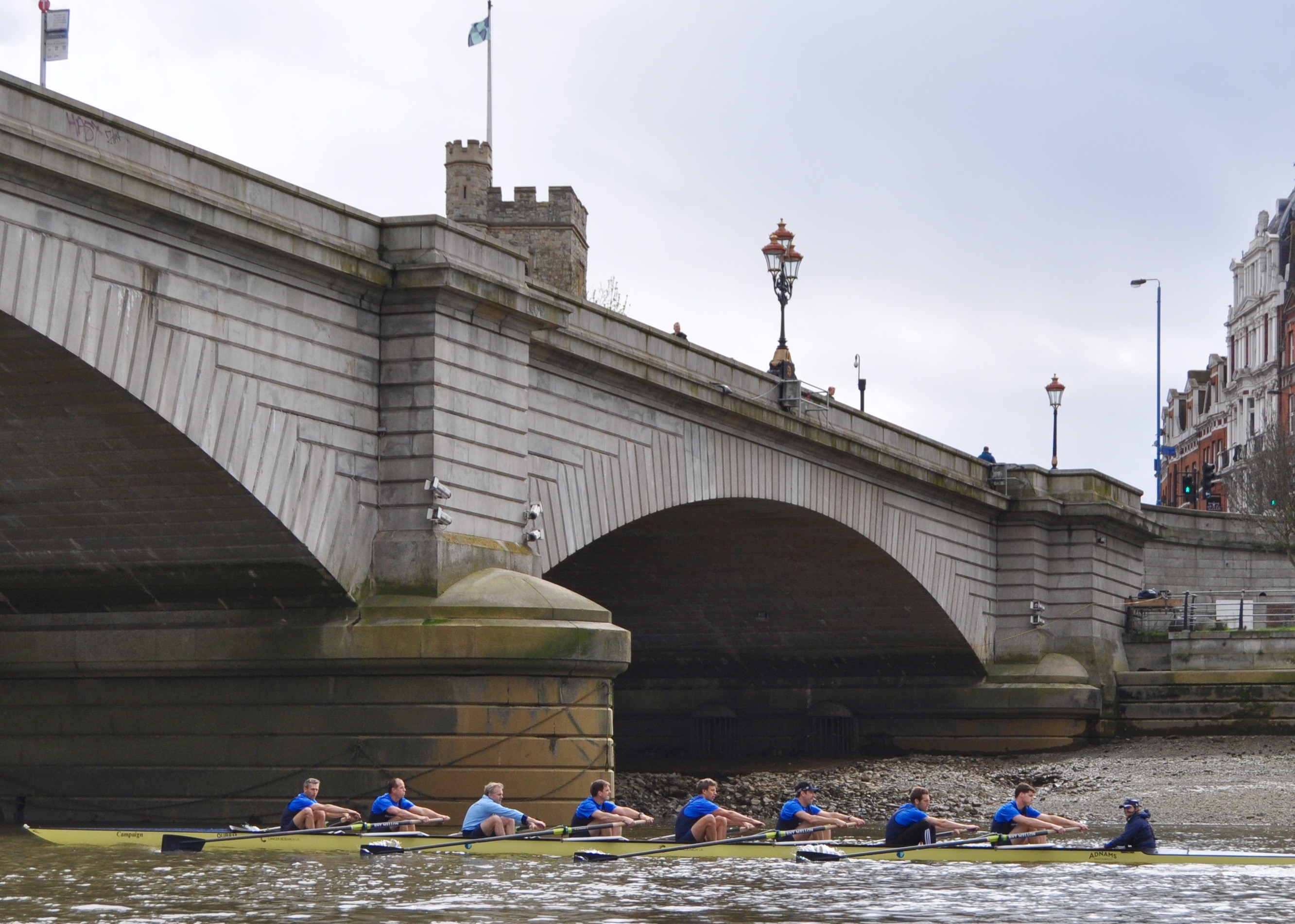 It was no surprise when both crews, Oxford on Middlesex and Cambridge on Surrey, went off at 38, but when the time to settle down to ‘race pace’ quickly came, the Cambridge veterans conventionally went down to 33 but Oxford old boys only dropped two or three pips. As a result of this and their terrific start, the Dark Blues had clear water by the end of Putney Embankment, had perhaps doubled this after the football ground and maintained it to the Mile Post. In a two boat race, particularly one between two middle-aged crews of unpredictable endurance, it is a legitimate tactic to go off at a rate and a pressure that will empty the collective tank before the finish line. The theory is that, before the fuel runs out, the other crew will have effectively given up. Unfortunately for Oxford, no one told Cambridge that they were supposed to lose power, precision and pace after rapidly going two lengths down.