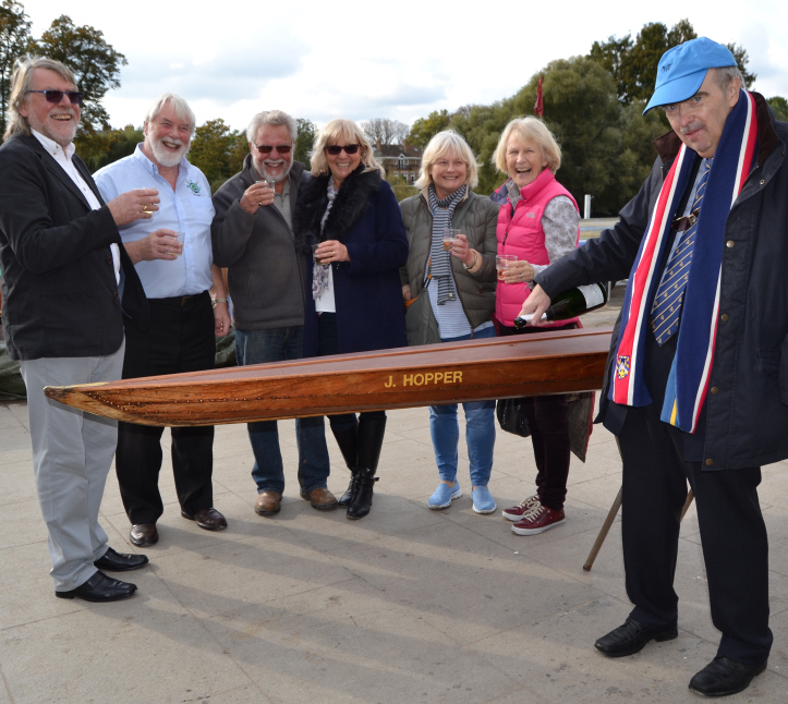 On Monday, 27 March, Clive Radley hosted a celebration party in the Rowing Gallery at the River and Rowing Museum (RRM) in Henley-on-Thames for 35 invited guests. The group was celebrating the installation of the J. Hopper, a wooden clinker single scull with plywood decks, built by Radley’s late uncle, Sid Radley, on the Lea in 1956.