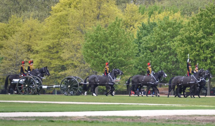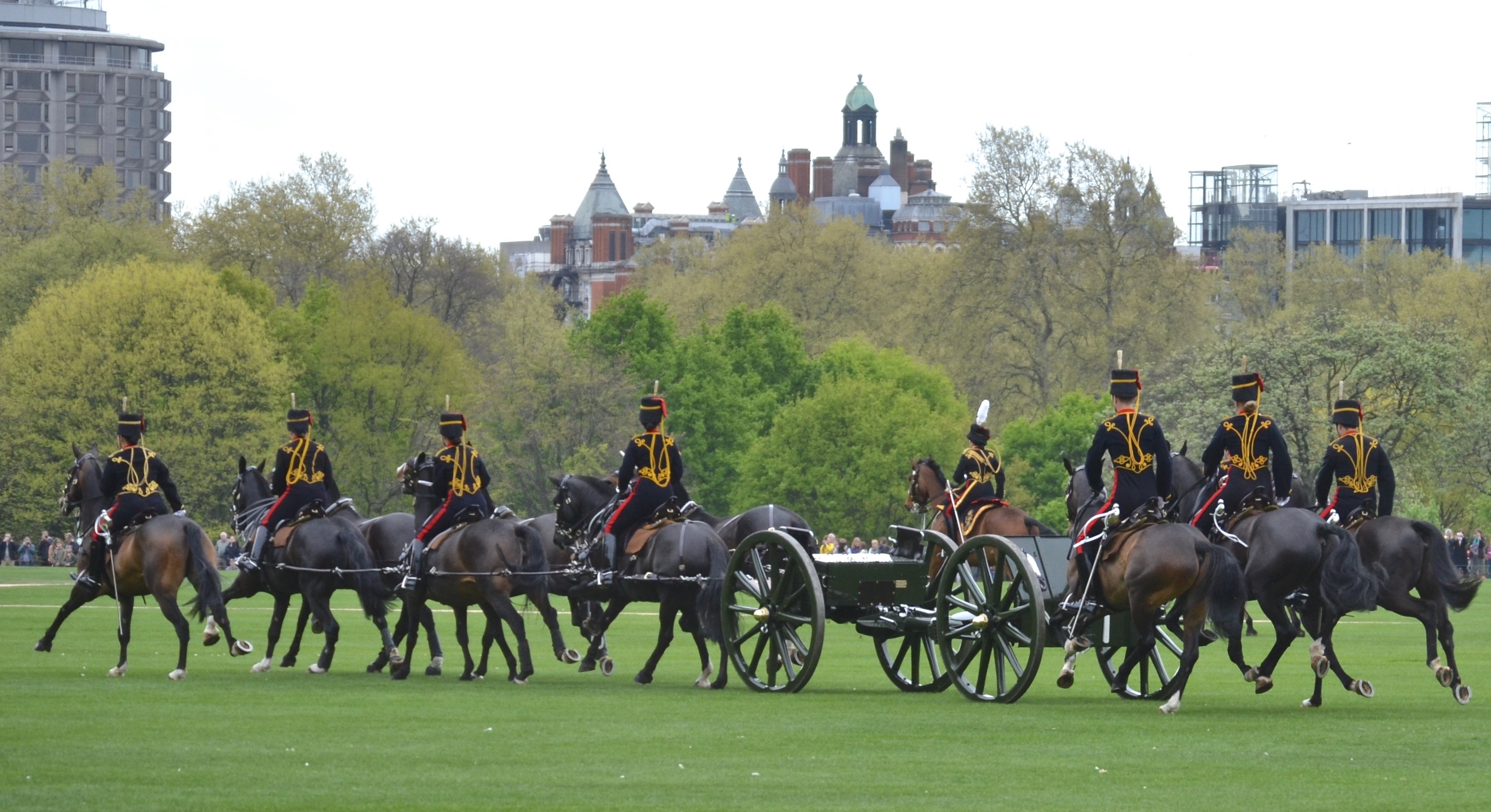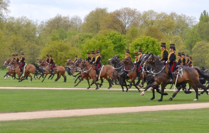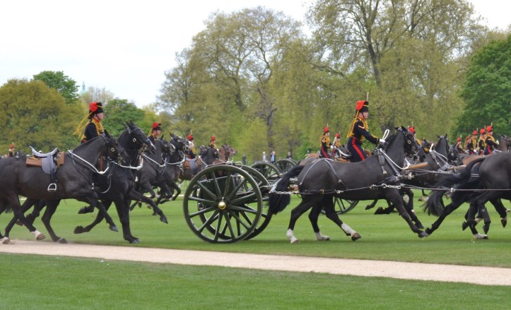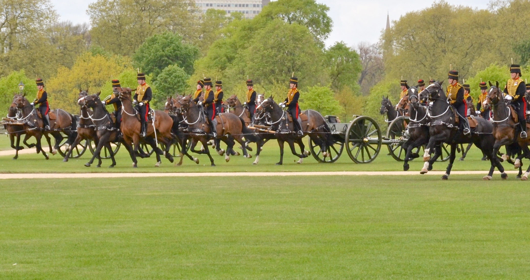 Gun salutes in Hyde Park and Green Park are carried out by The King’s Troop, Royal Horse Artillery. This is a ceremonial unit composed of ‘real soldiers’, members of the British Army’s Royal Regiment of Artillery, who drive teams of six horses pulling each of six First World War-era 13-pounder field guns. Its duties include the firing of salutes on royal anniversaries and state occasions, and providing a gun carriage and team of black horses for state and military funerals. The King’s Troop was formed after the Second World War, following the mechanisation of the last batteries of horse-drawn artillery, when King George VI wanted a troop of horse artillery to be retained to take part in great state ceremonies.