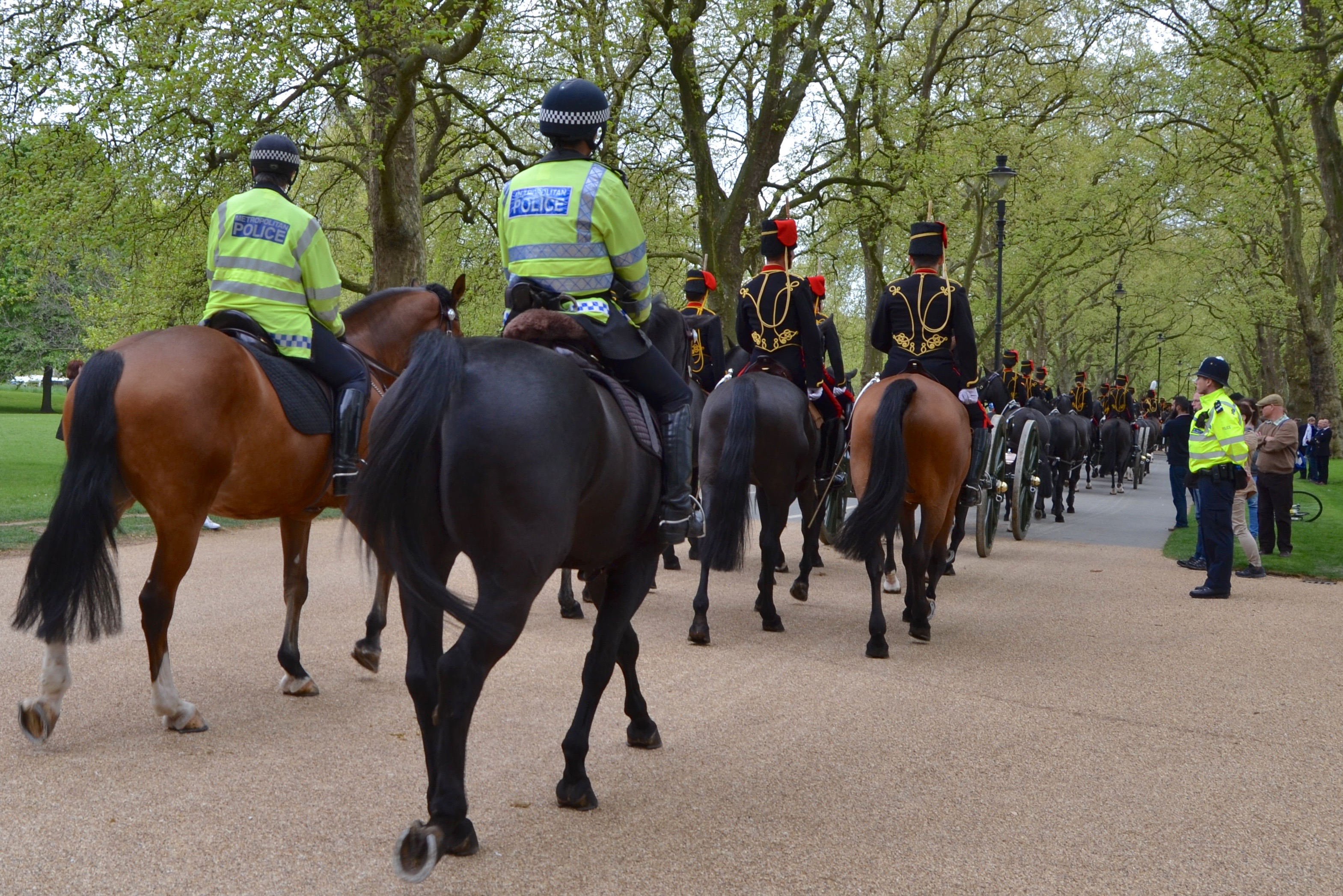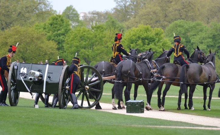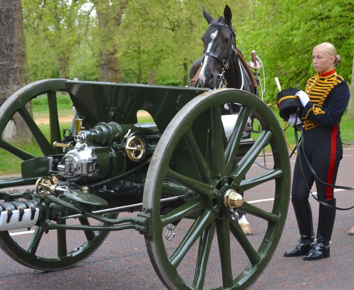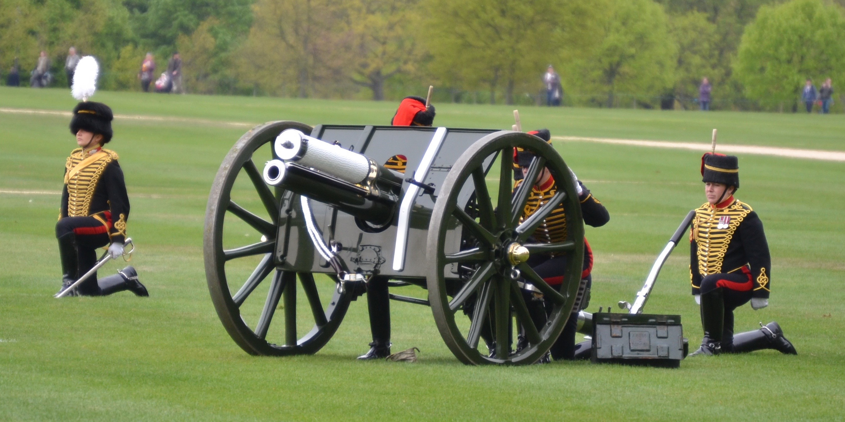 Gun salutes in Hyde Park and Green Park are carried out by The King’s Troop, Royal Horse Artillery. This is a ceremonial unit composed of ‘real soldiers’, members of the British Army’s Royal Regiment of Artillery, who drive teams of six horses pulling each of six First World War-era 13-pounder field guns. Its duties include the firing of salutes on royal anniversaries and state occasions, and providing a gun carriage and team of black horses for state and military funerals. The King’s Troop was formed after the Second World War, following the mechanisation of the last batteries of horse-drawn artillery, when King George VI wanted a troop of horse artillery to be retained to take part in great state ceremonies.