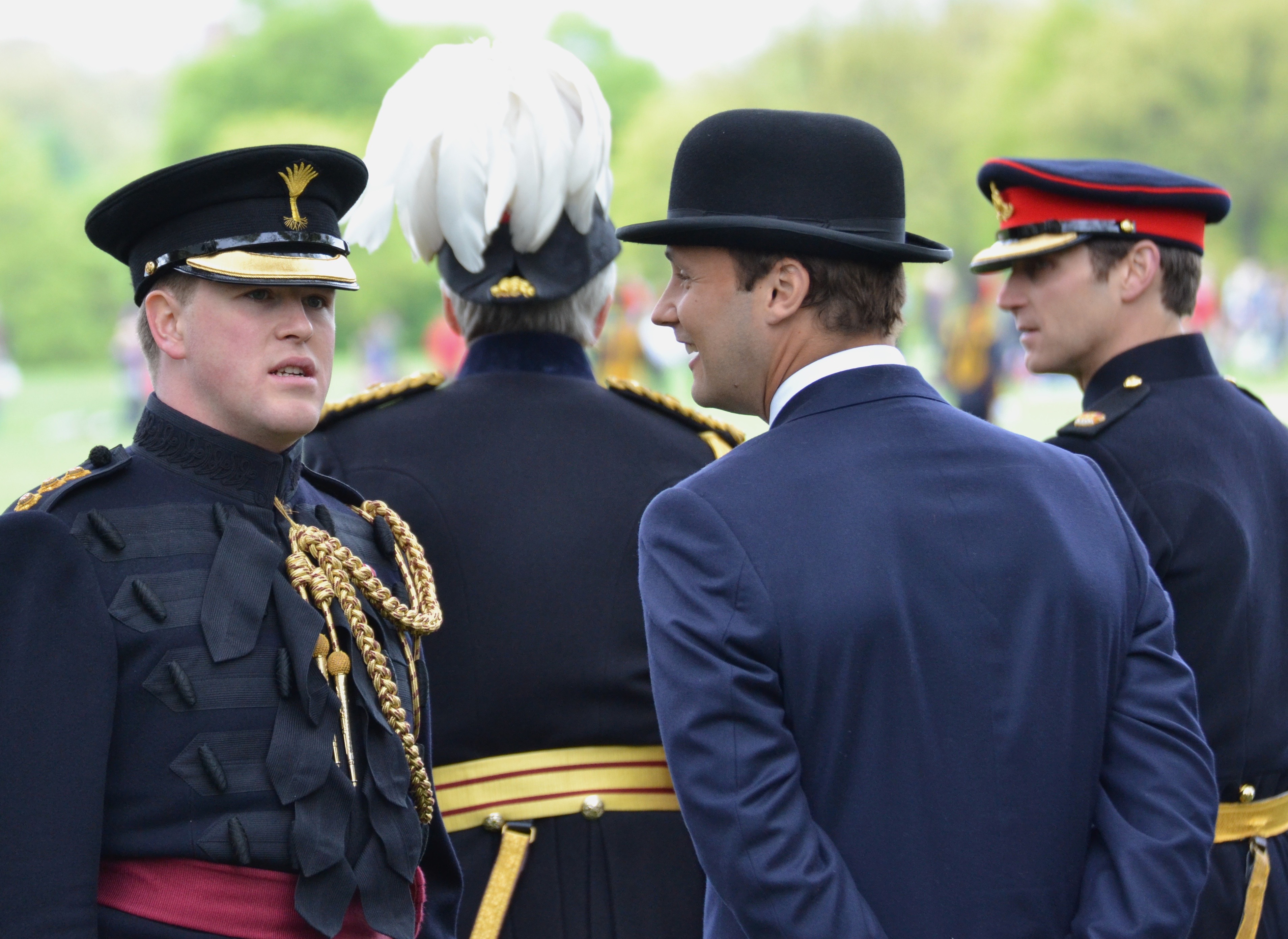 VIPs and veteran and serving soldiers gathered for the occasion. On the left is a captain in the Welsh Guards. With a chicken on his head is Major General Ben Bathurst, General Officer Commanding London District. The gentleman in the bowler hat wears a Brigade of Guards tie (unseen here). On the right is a major in the Royal Artillery.