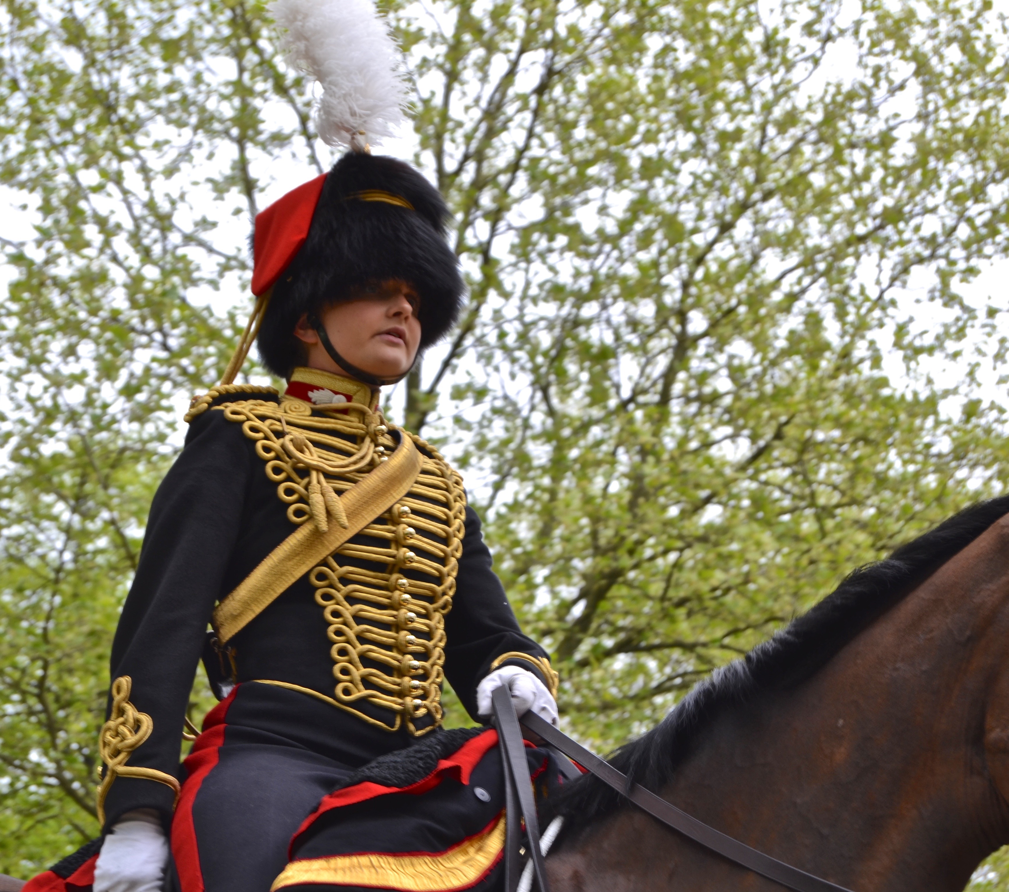The uniform and fur cap were inspired by the dress of the Hungarian light cavalrymen known as Hussars. The cap is known as a busby, a name wrongly sometimes given to the tall bearskin ‘caps’ of the Foot Guards. Originally, the end of the red cloth bag was attached to the right shoulder as a (perhaps wishful) defence against sabre cuts.