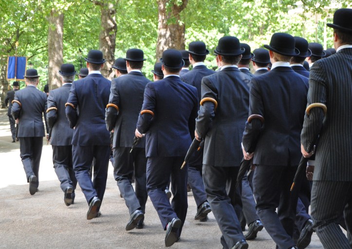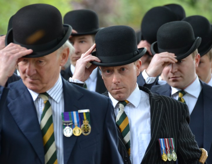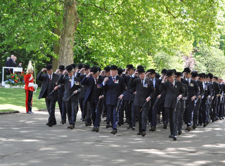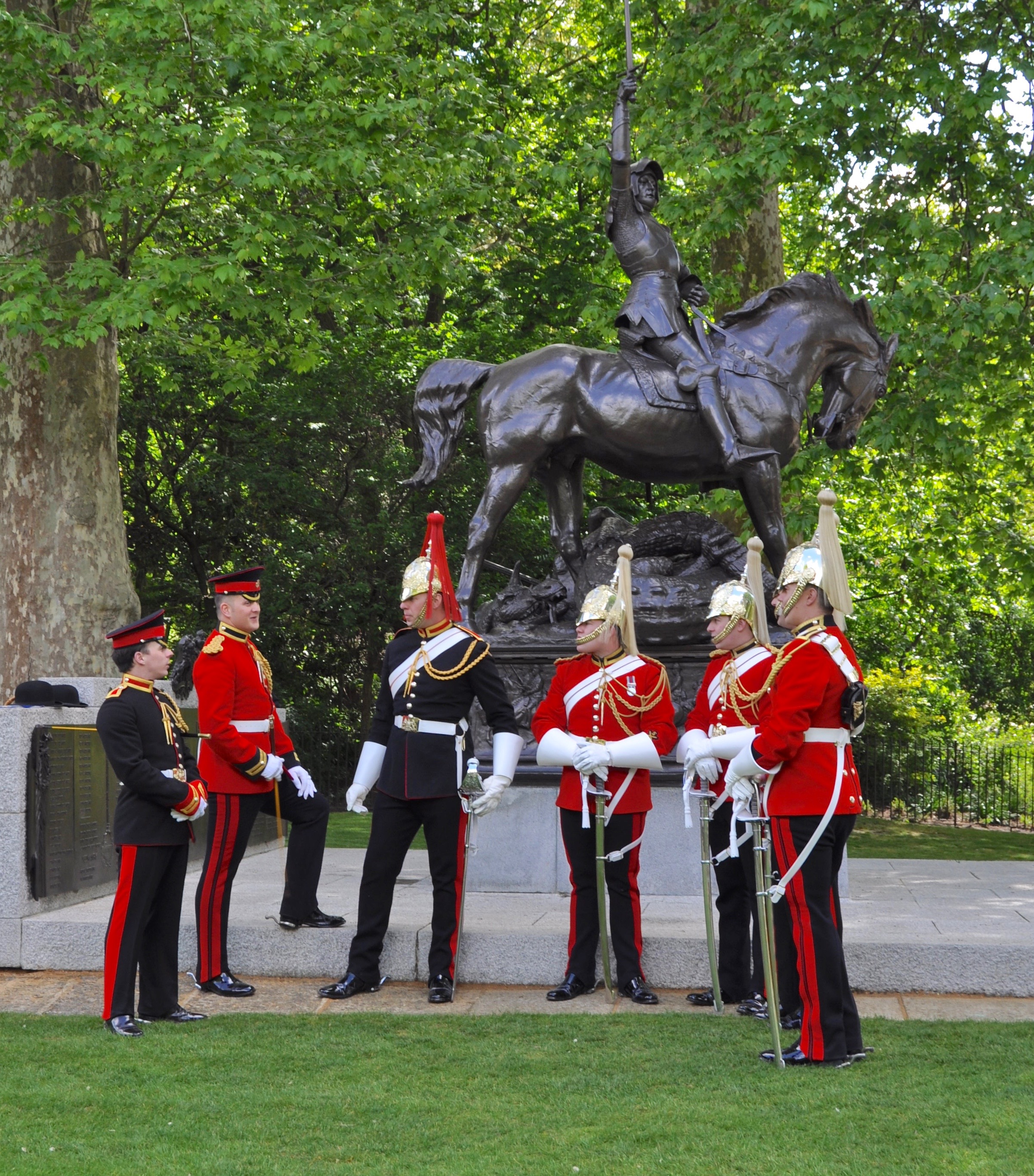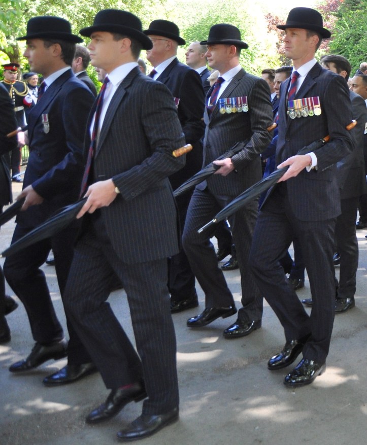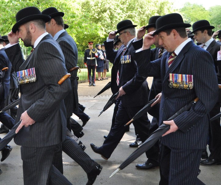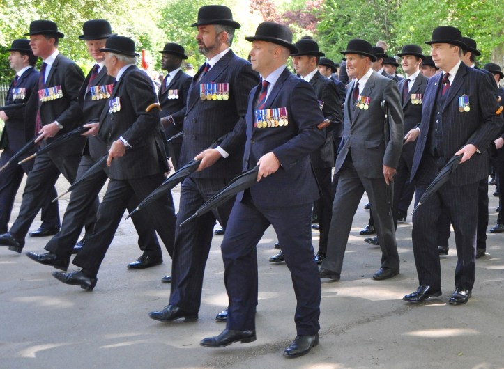On Sunday, 14 May, I attended ‘Cavalry Sunday’, a memorial parade that is as poignant as any in its remembering of those killed in conflicts past – but which has a unique aspect to its ceremonial. The Combined Cavalry Old Comrades Association Parade and Memorial Service is held on a Sunday in May every year when former members of British cavalry regiments march past the Cavalry Memorial in Hyde Park and then hold a short service, also attended by family and friends. Many of those parading carry furled umbrellas held in a particular way (sword substitutes perhaps), and wear bowler hats (U.S.: derbys), the stereotypical British headgear that is rarely seen nowadays. Officially, the dress is simply lounge suits with medals and decorations.