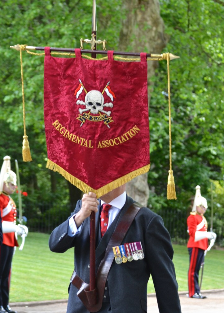 Two former members of The Royal Scots Dragoon Guards (Carabiniers and Greys) with the banner that the regiment’s veterans will march behind on the memorial parade. It is topped with a representation of the French Imperial Eagle that the Royal Scots Greys captured at Waterloo in 1815.