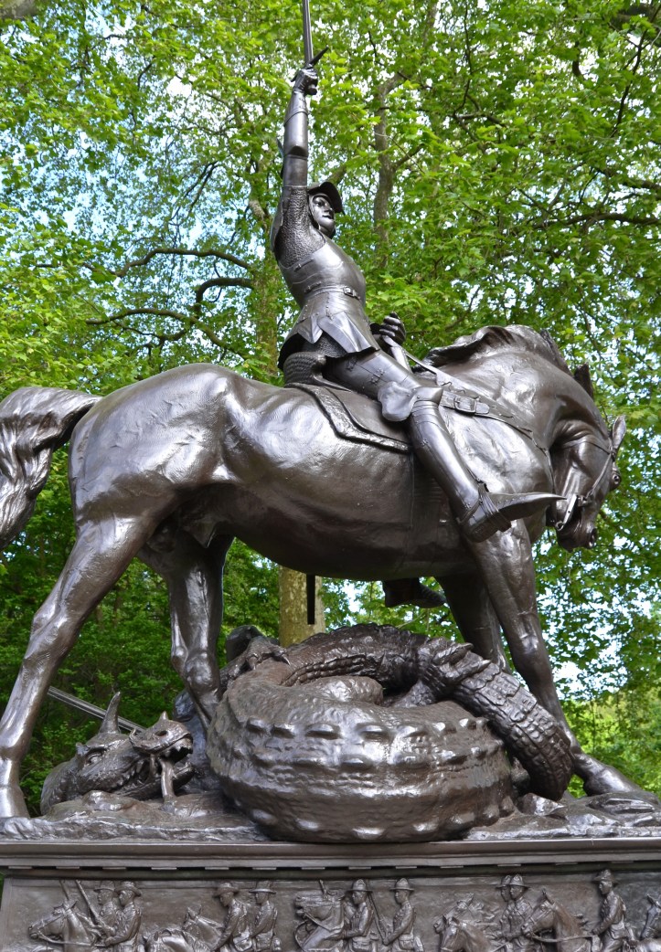 The Cavalry Memorial, partly cast from guns captured by the cavalry in the First World War. It shows England’s patron saint, St George, depicted as a mounted knight in armour with his horse standing over a slain dragon – which, incongruously, has an upturned Germanic moustache, as worn by the Kaiser. Embarrassingly, at the outbreak of war in 1914, the German Emperor was Honorary Colonel-in-Chief of the 1st Royal Dragoons, and Emperor Franz Josef of Austria had the same position with the King’s Dragoon Guards.