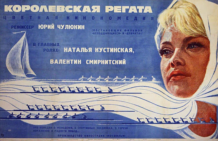 Classic film poster in blue and yellow: Королевская регата (Korolevskaya Regata) – Royal Regatta (1966) – A great image featuring Alena, a stewardess played by Natalia Kustinskaya, in the foreground with three rowing eights racing in the background.