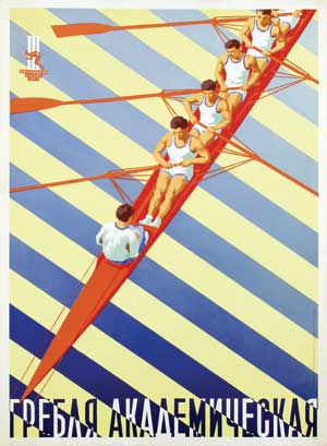 Promotional poster for the Third International Friendly Youth Games held in Moscow 1957. Cross-eyed? Don’t look at the angles of the bowside/starboard oars. It may be technically impossible to row like this but it is a lovely poster.