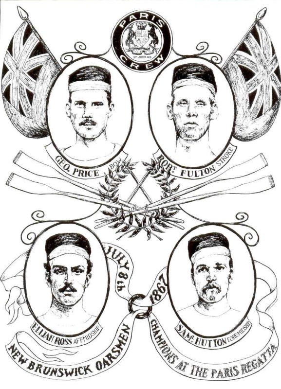 On 8 July 1867, oarsmen Robert Fulton, Elijah Ross, George Price and Samuel Hutton (with their spare rower James Price) of Saint John, New Brunswick, surprised the rowing world at the World Amateur Rowing Championship held at the International Exposition in Paris by beating Oxford University and London RC taking the World title in the coxless four. As it was only seven days after the Canadian Confederation, the Paris Crew, as they came to be known, became Canada’s first international sporting champions.