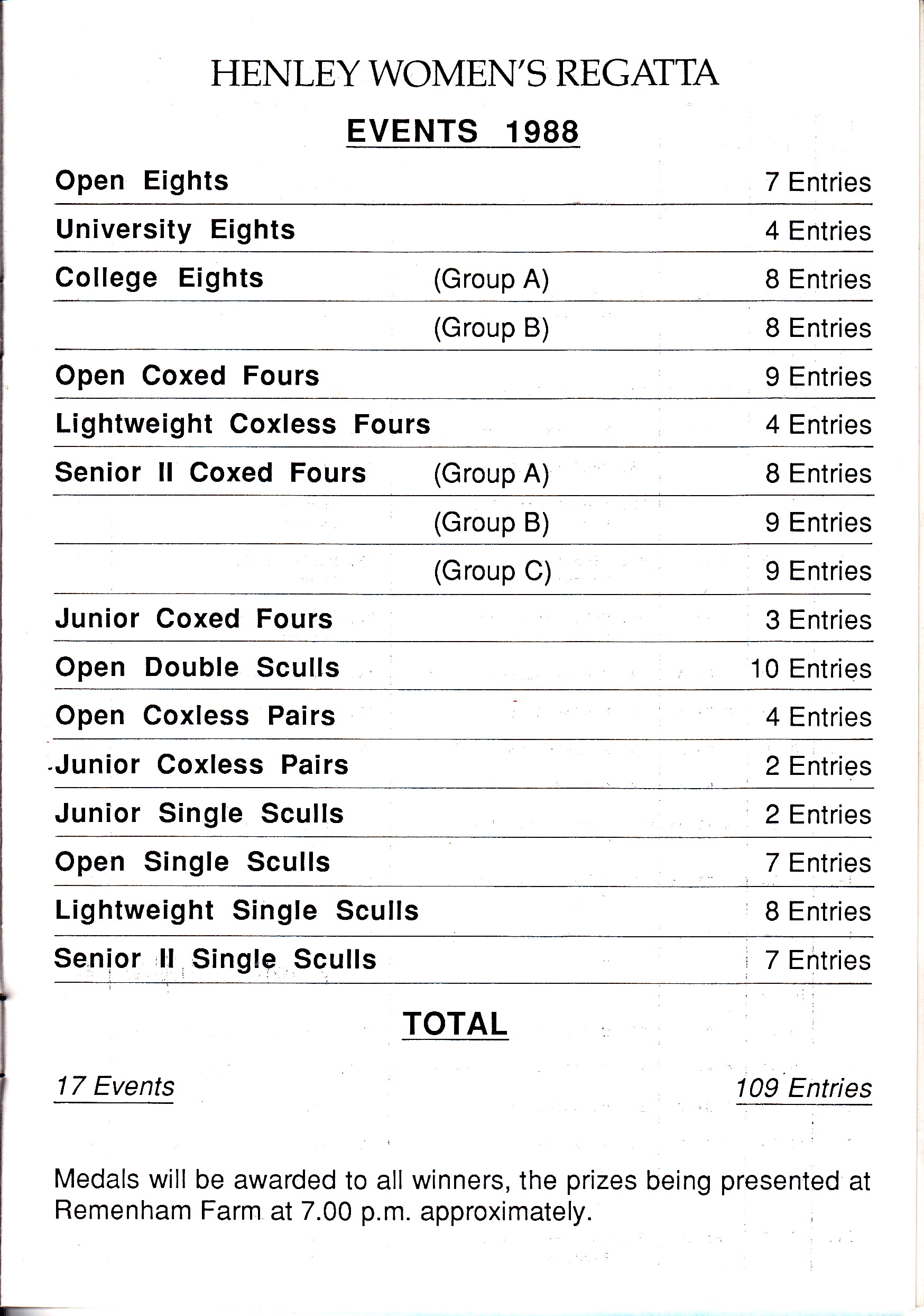 It does not seem like 30 years ago that I attended the first Henley Women’s Regatta (HWR), held over one very long day on Saturday, 18 June 1988. I still have the programme and it shows that 97 races ran between 9 a.m. and 7 p.m. without any breaks (over a 2000m course) and that there were 109 entries by 500 competitors for 17 events. In a ‘Message from the Chairman’, Chris Aistrop wrote: