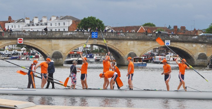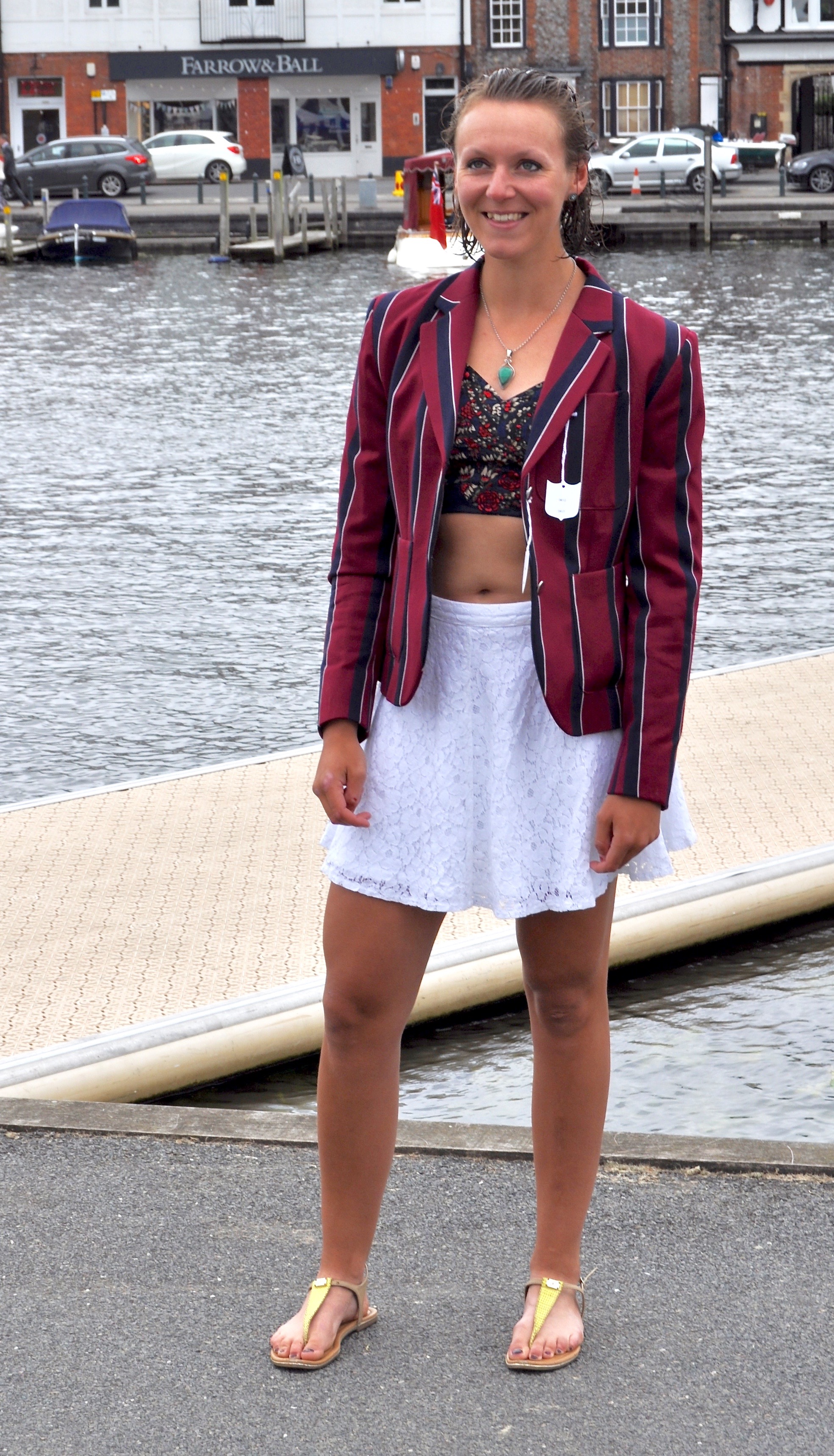Abingdon School receive a pre-race briefing prior to their race against Shiplake College in the Princes Elizabeth Challenge Cup. They eventually lost.Lea from East London boat for their ultimately unsuccessful heat of the Thames Challenge Cup against Agecroft from Manchester.WH Mackworth-Praed (bow) and EJ Barton (stroke) after losing to Team Italia, Italy, in the Double Sculls. Mackworth-Praed is the oldest rower in the regatta.The girls of Oxford Brookes cheer their boys as they go out for their race against Nereus from the Netherlands in the Temple Challenge Cup. Brookes went on to win.This Brookes rower’s outfit will not get her into the Stewards’ Enclosure, but it is none the worse for that.Yesterday, I mentioned that Jack Carlson, he of the ‘Rowing Blazer’ book, is now designing and manufacturing the classic jacket. He is here with Japanese menswear guru Motofumi ‘Poggy’ Kogi,who is wearing Jack’s stripy ‘Croquet’ blazer.A member of both London Rowing Club and Leander Club.Looking like some revived vaudeville act, rowing historians Tim Koch (left) and Peter Mallory.An elegant supporter of the Gonzaga College High School Crew brings blades for their race against Winchester College in the Princess Elizabeth, a heat which they won.Boats are removed from the boat tents very soon after their crews are defeated. An interesting mixture of club allegiances are modelled here.