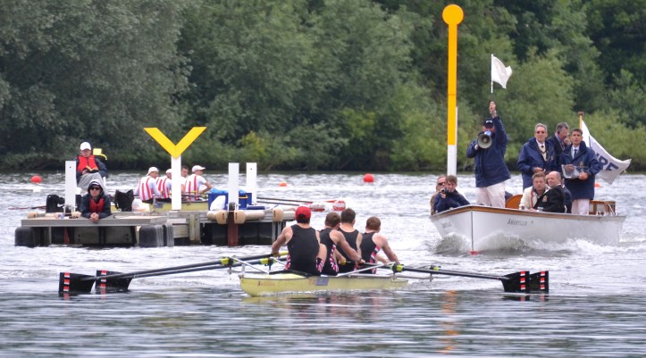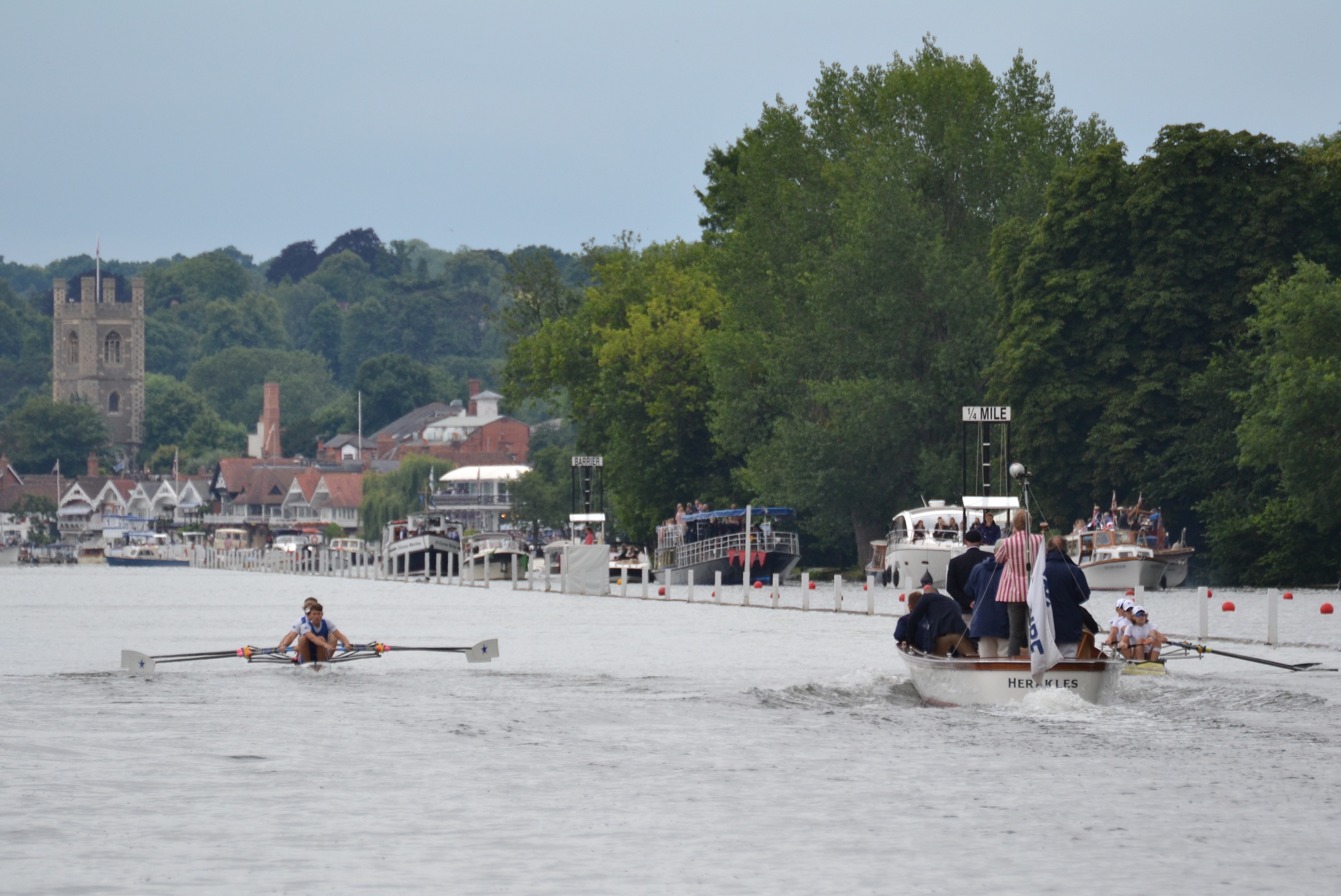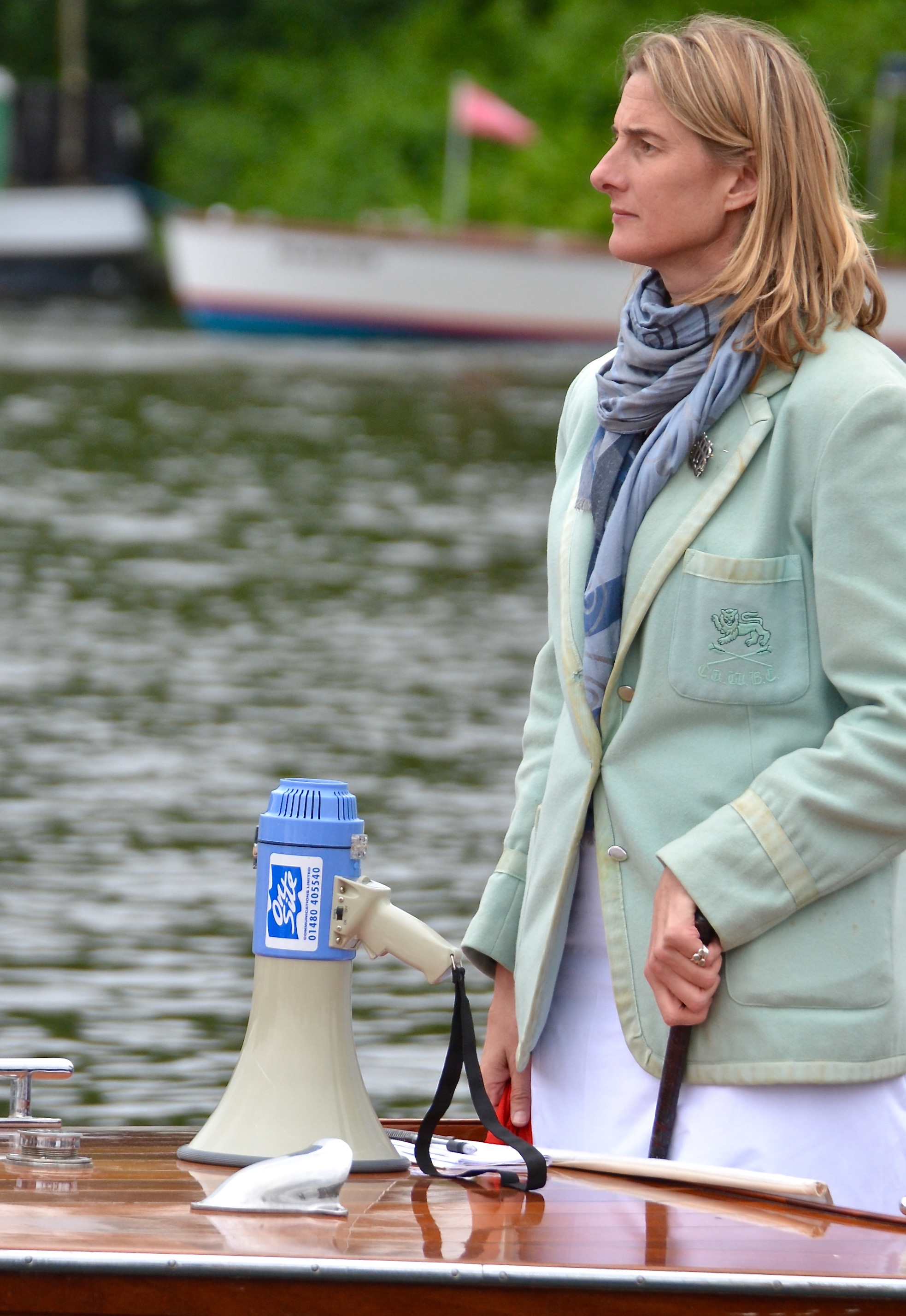 Umpire Pinsent, about to start a heat of the Wyfolds in which Maidenhead (left) race Thames (right).Maidenhead v Thames: An early warning for Thames.Maidenhead v Thames: Along the Island.Maidenhead v Thames: Passing the Temple.Newcastle University (left) against Deerfield Academy (USA) in the Prince Albert. The Brits won.In the Princess Elizabeth’s all-American heat, Kent School…… raced Deerfield Academy (who won).Sarah Winckless, the first woman to umpire at Henley, about to take charge of a heat of the Wyfolds.