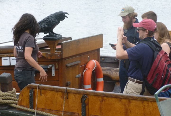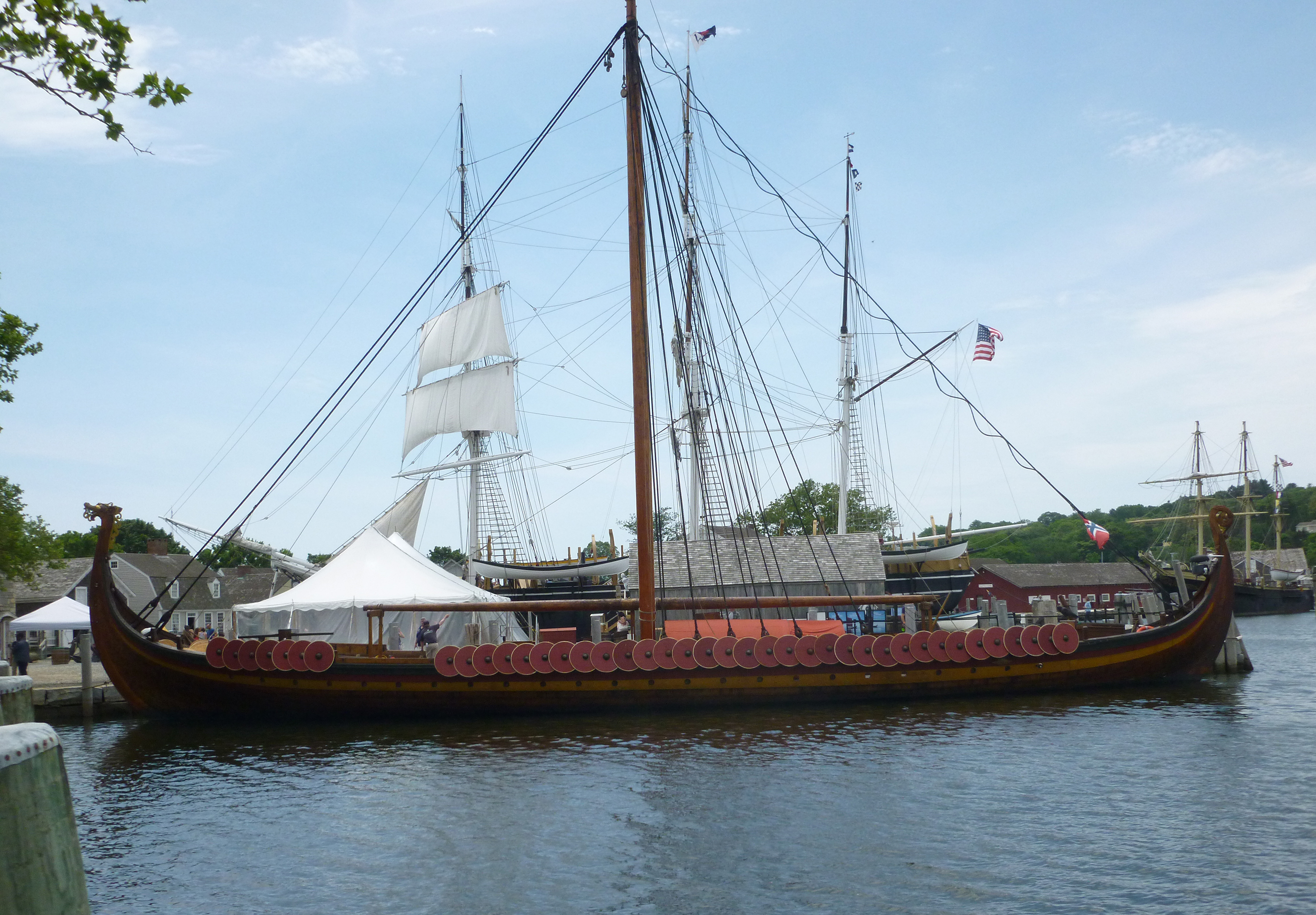 An outing on the river. Starting with tossing the oars.The 115-foot (35-metre) “Draken Harald Hårfagre” will be open for tours between 30 June and 4 September. Take a look here.Next tour is coming up on the Viking longship. This “Draken Harald Hårfagre” volunteer got the job as a ‘lur’ blower thanks to his skills on the trombone.One of the first thing visitors meet when they go on board “Draken Harald Hårfagre” is one of Odin’s ravens, Huginn or Muninn, take your pick.The dragon head on the Viking ship is one of the most photographed objects at Mystic Seaport this summer.Dogs might be the animal on board a Thames skiff or a rowing boat, but on board a sailing boat it should be a cat, preferably by the name of Joey.