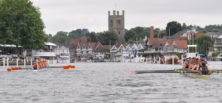 I have been attending the Henley Royal Regatta as a spectator for many years and have always wanted to follow a race in the umpire’s launch. This year, my wish was fulfilled when Sally Lawrence of the Lea Rowing Club kindly invited me to watch Lea’s First Eight compete in Henley’s club eights event, The Thames Cup, from the umpire’s launch on the regatta’s opening day. The opposing crew was from Tim Koch’s club, Auriol Kensington, and he sat opposite me taking photographs of the race.
