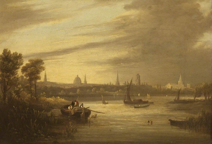 At first glance the scene looks like it is situated on that portion of the Isis immediately below Folly Bridge, and adjoining Christ Church Meadow, rather than from the west of the town. However, closer examination, in particular a careful alignment of the spires in the distance, shows that this is indeed from the vicinity of Ferry Hinksey, or just downstream of it.