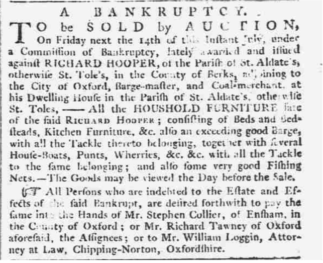Mrs Hooper would appear to have been the widow of a Richard Hooper of St Aldates, a barge master who was bankrupted in 1780. His estate in bankruptcy included “an exceedingly good Barge… several House-boats, Punts, Wherries &c. &c, with all the tackle to the same belonging.”(9) There was clearly a good living to be had in Oxford from at least the late 1770s in hiring out boats to students, and this is indicative of recreational rowing being reasonably well supported.