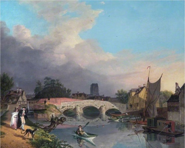 A picture in the Oxford County Museum, entitled “Old Hythe Bridge and Oxford Castle”, and painted by Michael “Angelo” Rooker (Figure 5). It shows an undergraduate in a canoe, as well as four identical canoes and a four-oared rowing boat tied up by the bridge. The Castle Mill Stream flows south past the bridge and the remains of the castle before meeting the main channel beyond the castle near the confluence with the Bulstake Stream. The extreme left of the painting shows the last section of the Oxford canal has been completed, although the final work on the lock connecting the canal to the Castle Mill Stream has not been finished. This allows us to definitively date the painting to 1790.