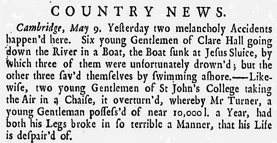 The earliest recorded drowning related to recreational rowing comes from Cambridge in 1743 (Figure 6). The Newcastle Courant reported in May that six men from Clare Hall had been going downstream when their boat overturned at the Jesus sluice.(18)