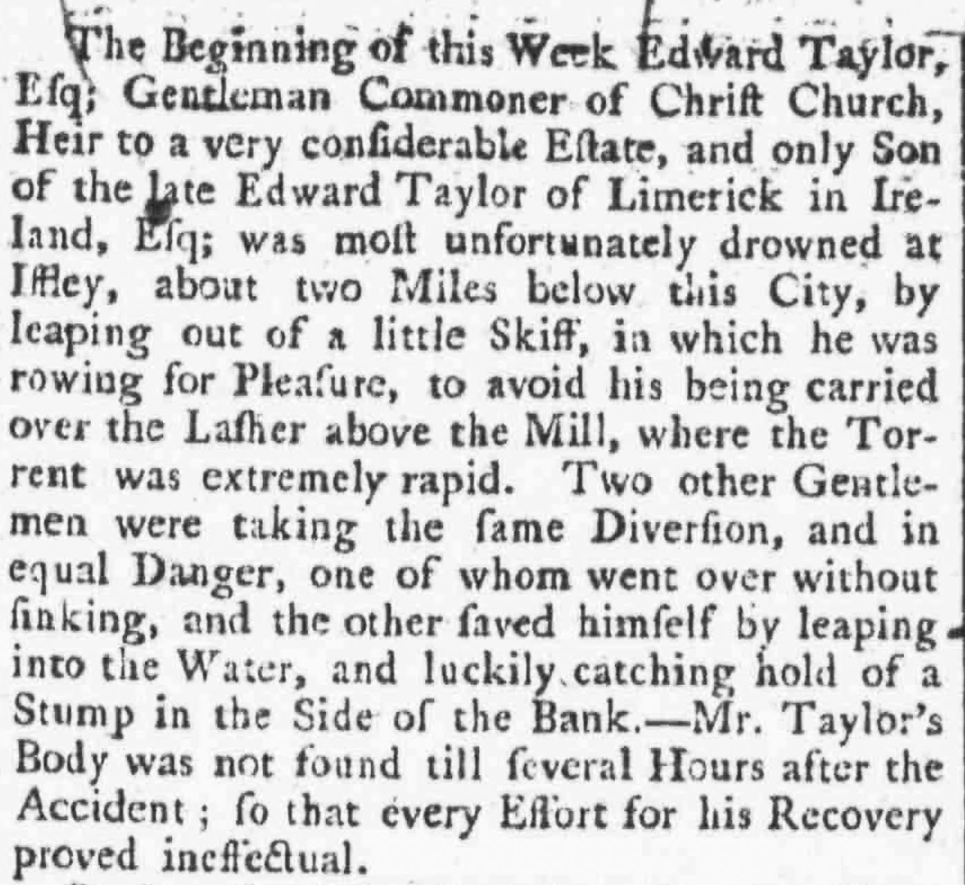 Apparently, three students were rowing in skiffs near the lffley lock when they got into trouble. One of them, Edward Taylor, of Christ Church, leapt out of his boat to avoid going over the lasher above the mill. He was sucked under by the current and drowned. Another also abandoned his boat and managed to grab hold of a stump sticking out of the bank, thereby pulling himself to shore. The third went over the lasher and miraculously survived without sinking.(20)