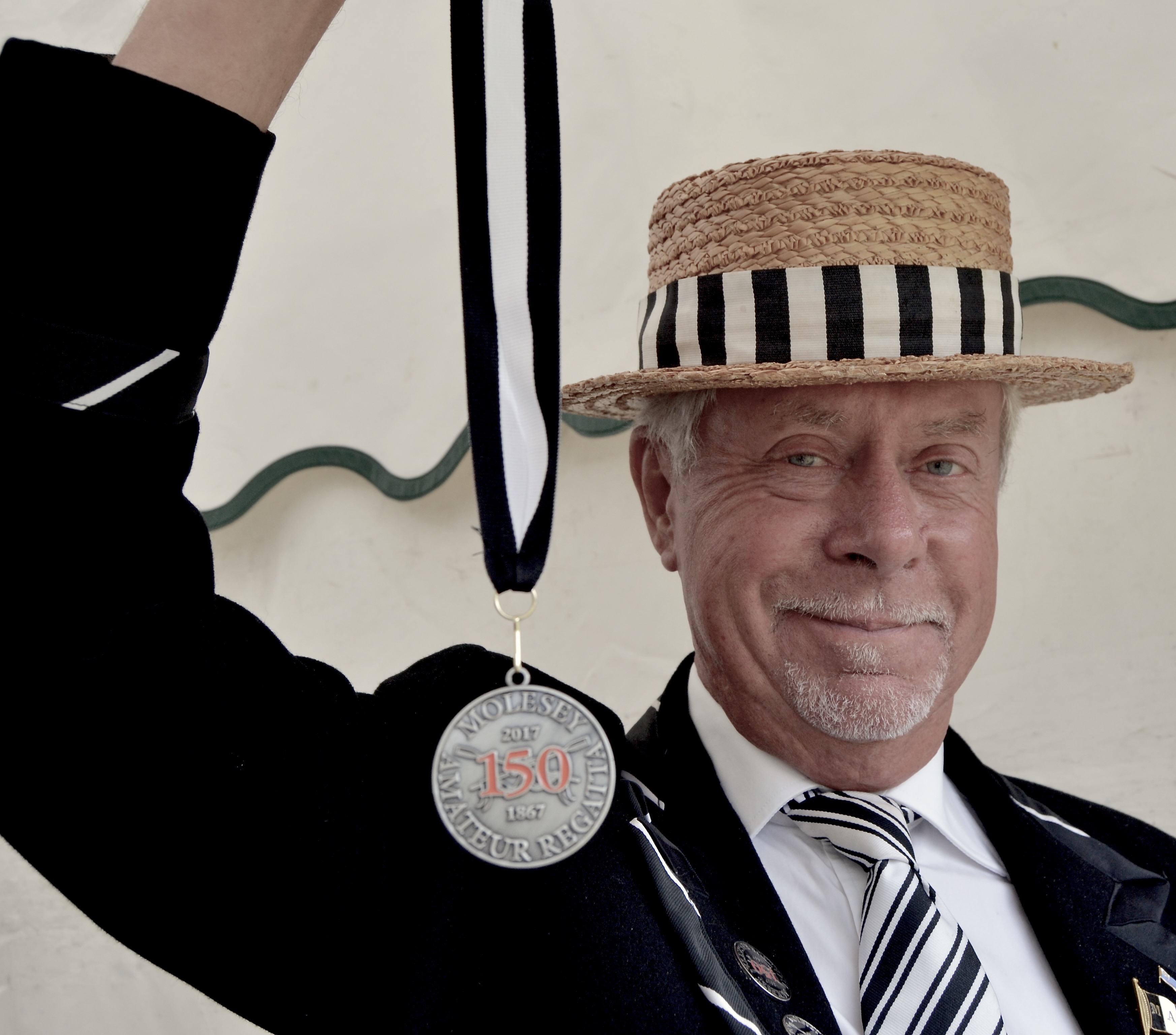 An official of Molesey Amateur Regatta displays one of the special medals that each winner received in 2017, the event’s 150th year.