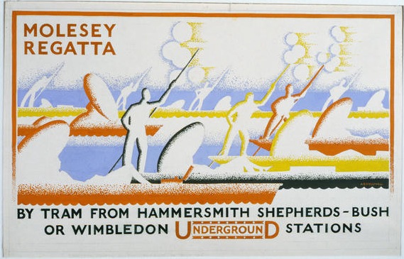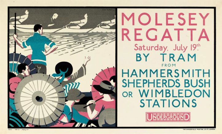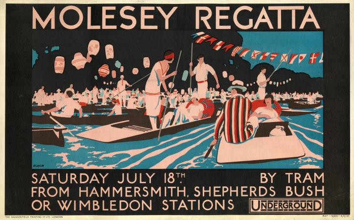 Molesey’s reign as a fashionable and prestigious regatta survived the 1914 – 1918 War and this is well illustrated by the iconic ‘jazz age’ posters that London Transport produced to promote travel to the event in the 1920s.