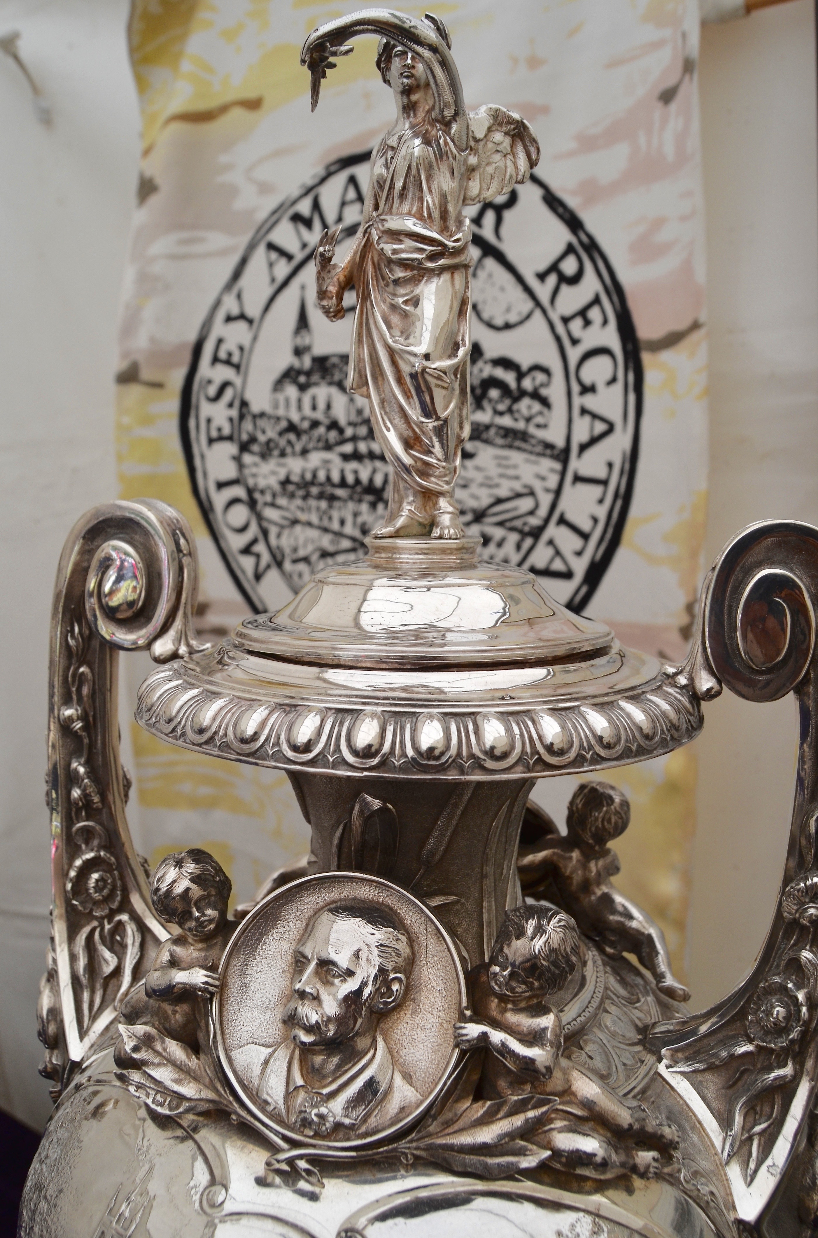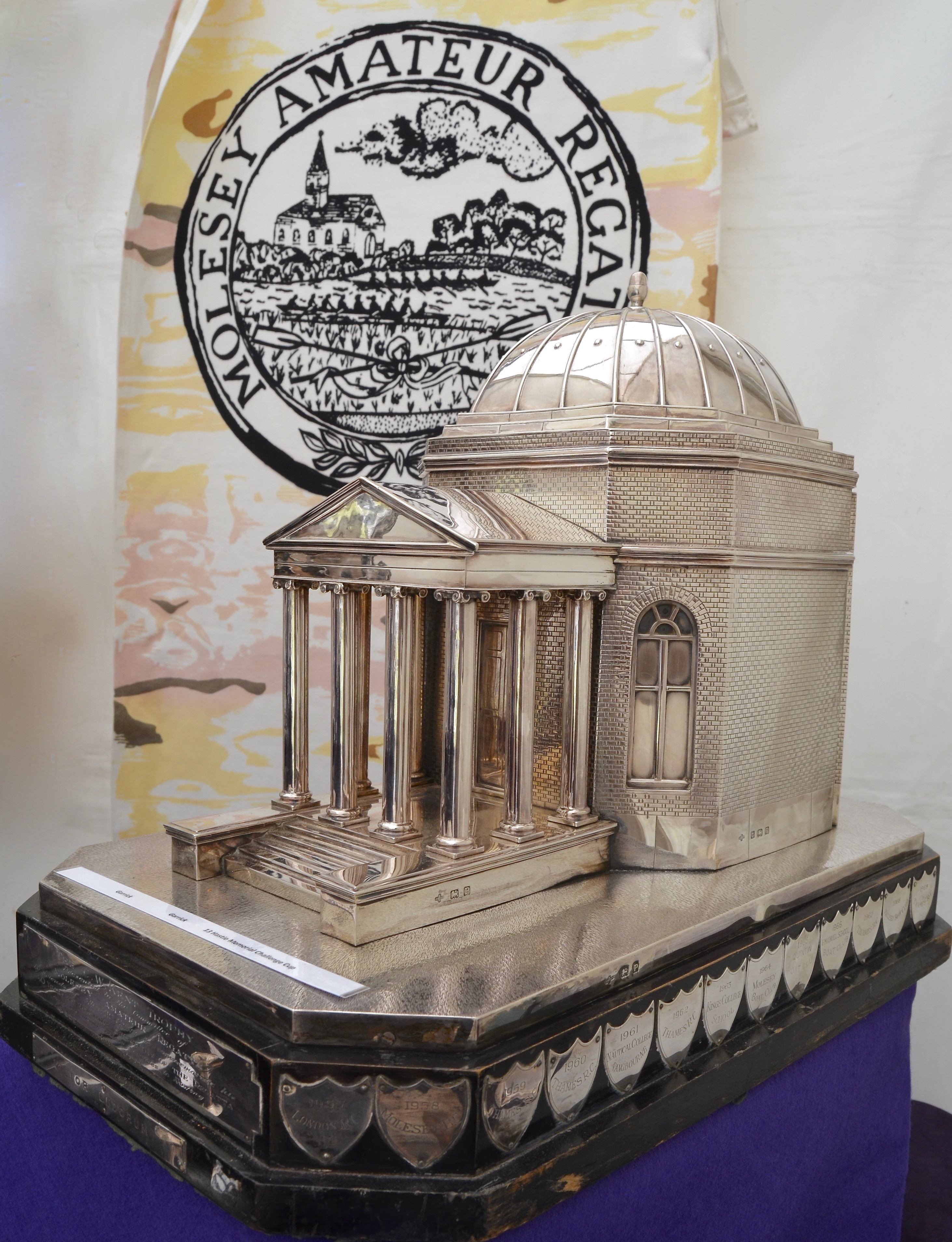 The best of the best is the trophy for the Victor Ludorum, a magnificent silver copy of the nearby Garrick’s Temple. A plaque reads: ‘The CW Kent Trophy. Presented to the Molesey Amateur Regatta by friends of Mr CW Kent to commemorate his 40 years as Honorary Secretary of the Regatta and his many other services to rowing. July 1939.’