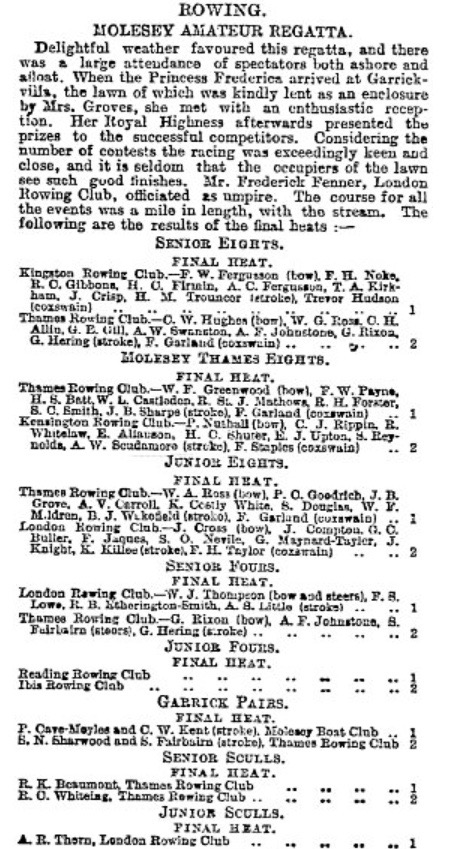 “The Times” report of 26 July 1897 recording the finalists at Molesey Regatta. The ‘Grand Old Clubs’ such as London, Thames, Molesey and Kingston all sent their best crews to what was then one of the top regattas.