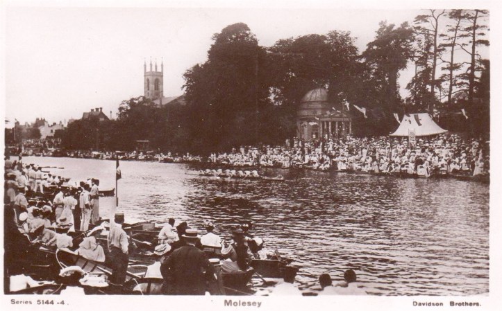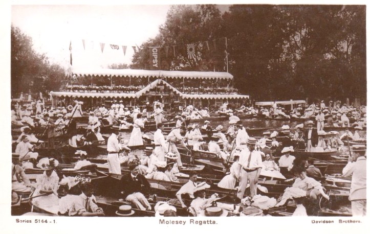 The social importance of Molesey in the late Victorian, Edwardian, inter-war period (when all classes seemed determined to go afloat whenever possible, in any craft available) is best illustrated visually, though the Surrey Comet of 1876 produced a nice image in words: