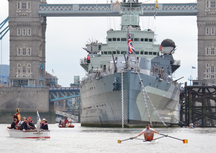 25 July dawned warm and cloudy, with by late morning a few hints of sun and the slightest of breezes barely ruffling the water. Conditions were as close to ideal as you can get on the Tideway. The four scullers – Perry Flynn in dark blue, Alfie Anderson in red, George McCarthy in light blue and Keech in orange – mustered around the bow of HMS Belfast, whose cannons had earlier woken up drowsing spectators with a bang as they heralded the imminent race. Keech, aged 22, was the only first-time Doggett’s sculler, Flynn having competed in both the previous years while Anderson won the 2014 special anniversary wager and both he and McCarthy raced last year.