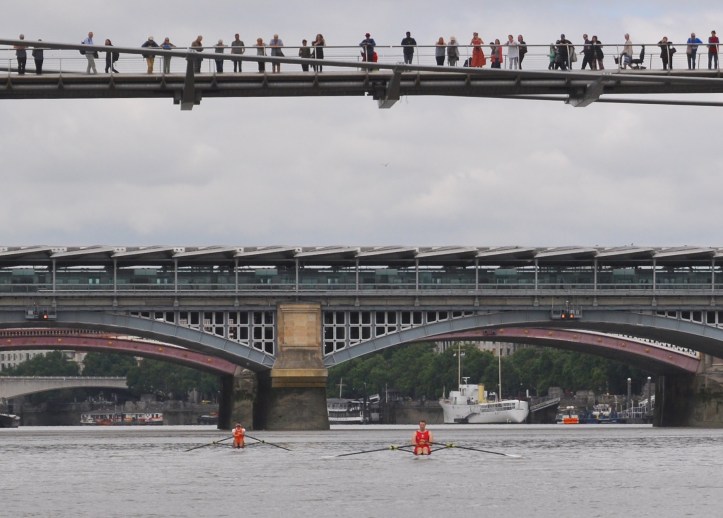A mere 250m in looms the Cannon Street rail bridge, and already the pattern of the race was set. Keech led, sculling powerfully and favouring the water slightly off-centre, while Anderson followed in second, Flynn dropped back rapidly on the southern shore and McCarthy was ploughing a lone furrow mid-stream but staying slightly ahead of Flynn. Before they reached the Millennium footbridge it was obvious that the race was Keech’s to lose. While Anderson used the tide well and doggedly forged on in second, Keech’s superior technique moved him effortlessly away with every stroke, and Flynn and McCarthy were considerably less confident by comparison with the two lead scullers.