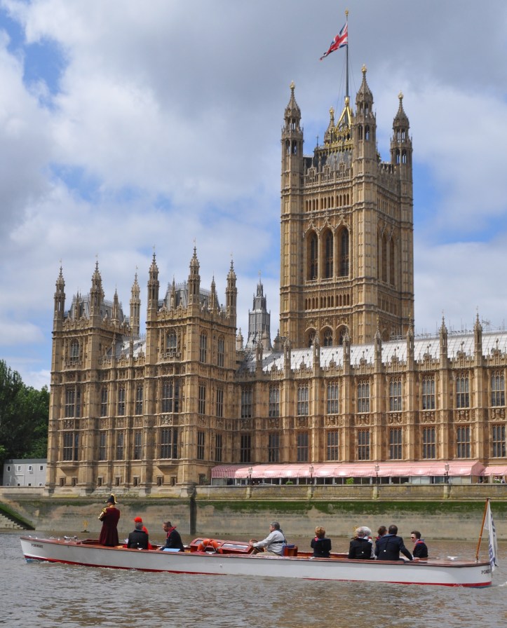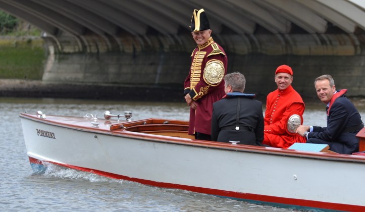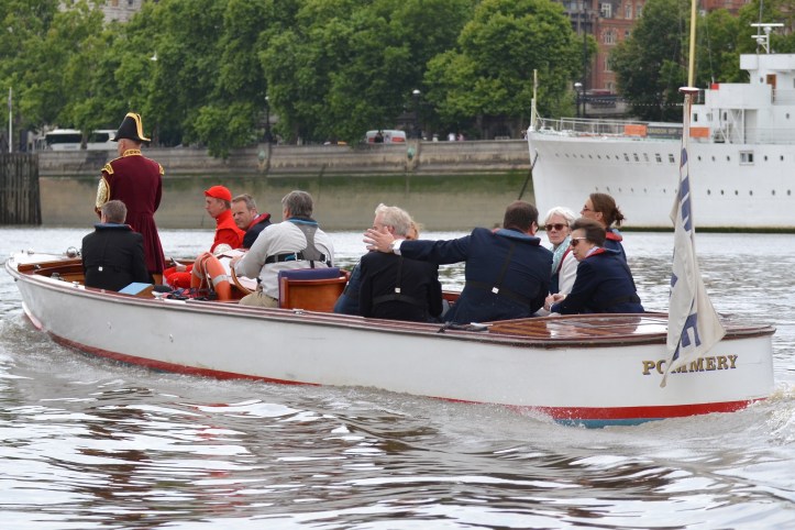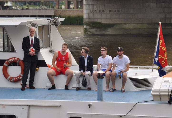 On board the umpire’s launch were dignitaries including Guest of Honour Major Heather Stanning OBE and the Fishmongers’ current Prime Warden Princess Anne. Also watching the scullers, including his young second cousin George, was the newly elected Waterman’s Company and 1984 Doggett’s winner, Simon McCarthy, whose son Harry won three years ago. The race was filmed, partly for live streaming but also because snippets will be used in a BBC2 documentary on rowing and watermen to be screened sometime in the autumn.