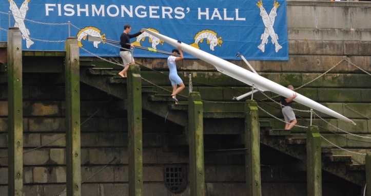 ‘He’s a great technician – he was sliding along beautiful,’ said Bargemaster and umpire Bobby Prentice afterwards. Prentice had been worried about the amount of downstream landwater slowing the incoming tide, so persuaded the Fishmongers to delay the race from the originally planned 11:30 start until the tide was definitely fast enough to keep up with the scullers.