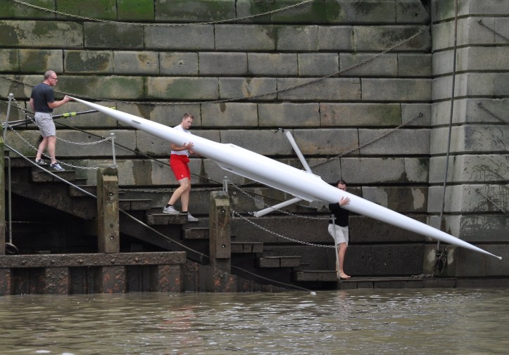 On reaching Lambeth Keech dropped his rate again, again cut the corners on the lethargic stream, but kept up a steady smooth stroke, economical and fluid. The umpire’s boat had passed Flynn by Waterloo Bridge, McCarthy after Vauxhall Bridge, and Anderson at Battersea Power Station, leaving Keech a solo coronation row to the finish line, followed only by the press and umpire’s launches along with the TV catamaran, as he sculled his way into the history books.